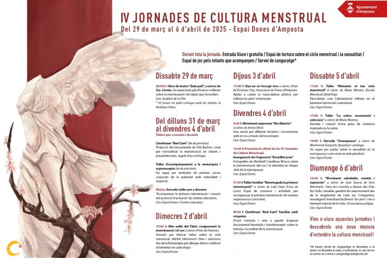 L’Espai Dones tornarà a ser l’epicentre de les Jornades de Cultura Menstrual, que celebraran la seva quarta edició, del 29 de març al 6 d’abril, amb una quinzena d’activitats al voltant del cicle menstrual en totes les seves etapes i tots els conceptes que se’n deriven. La primera tinent d’alcalde d’Amposta, Núria Marco, destacava que “les Jornades de Cultura Menstrual van ser una aposta innovadora, i continuem treballant per fer que aquestes activitats arribin a tots els públics, amb l’objectiu de desmitificar tot allò que afecta les dones”. Les jornades, organitzades per l’Ajuntament d’Amposta i Casa de Luna, tenen com a objectiu trencar els tabús que encara persisteixen al voltant de la menstruació i les fases vitals de la dona.