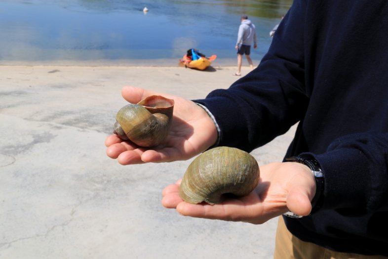 Técnicos de Tragsa y Paleoymas hacen muestreos semanales en todo el tramo del río, a pie por las orillas y con cayuco por el centro del río, y los hacen de día y sobre todo de noche, con linternas, porque es cuando más movilidad y voracidad tienen los caracoles.