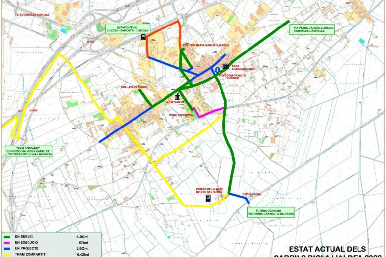 El Ayuntamiento de L’Aldea, tras la finalización de las obras de remodelación de la avenida Catalunya, la mejora del acceso a la escuela Mª Garcia Cabanes, y de la Vía Verde del Delta del Ebro , todas ellas dotadas por carriles bici, dispone de una red de carriles bici interconectados de 6.200 metros.