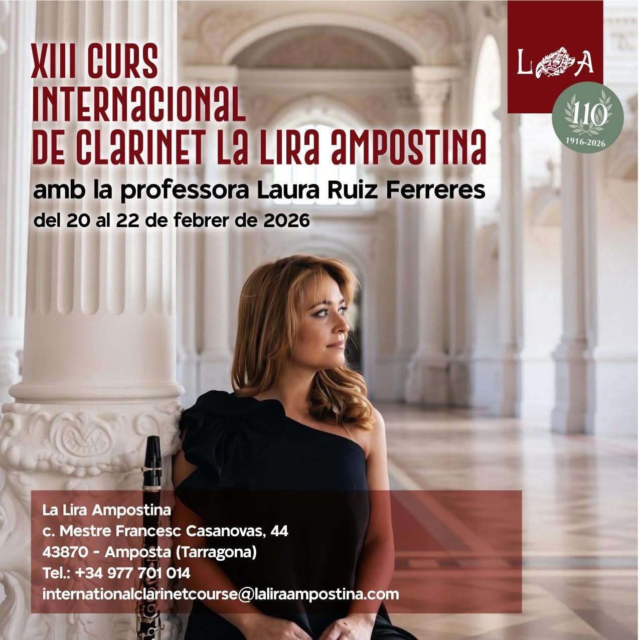 13è Curs Internacional de Clarinet – La Lira Ampostina Dates: 20, 21 i 22 de febrer de 2026 Ja estan obertes les inscripcions al 13è Curs Internacional de Clarinet, una formació intensiva adreçada especialment a alumnes de Grau Superior i Màster i a estudiants d’últim curs de Grau Professional que es preparen per accedir al superior. El curs ofereix classes individuals, treball tècnic i musical aprofundit, així com un simulacre de prova d’orquestra, amb l’objectiu de preparar l’alumnat per a les exigències reals dels estudis superiors i del món professional. Consulta tota la informació i formalitza la inscripció al web: https://www.laliraampostina.com/curs-internacional-clarinet-laura-ruiz-ferreres-la-lira-ampostina/