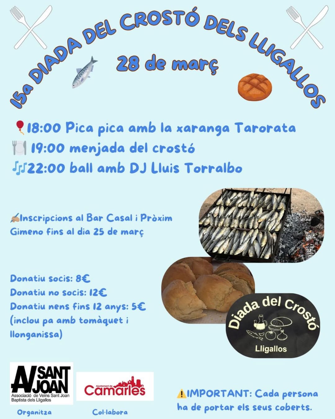La jornada començarà a les 18:00 amb un animat pica-pica acompanyat de la xaranga Tarorata, que posarà ritme i alegria a la trobada. A les 19:00 tindrà lloc la menjada del crostó, moment central de la celebració, i a partir de les 22:00, els participants podran gaudir del ball amb DJ Lluís Torralbo, que posarà el toc musical final a la vetllada.