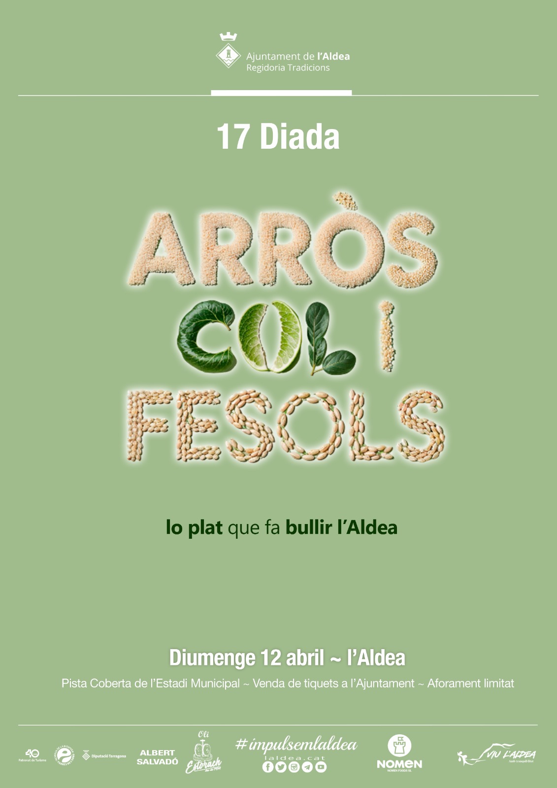 L’Aldea acollirà el pròxim diumenge 12 d’abril la 17a edició de la Diada de l’Arròs, Col i Fesols, una cita gastronòmica i tradicional que tindrà lloc a la pista coberta de l’Estadi Municipal.