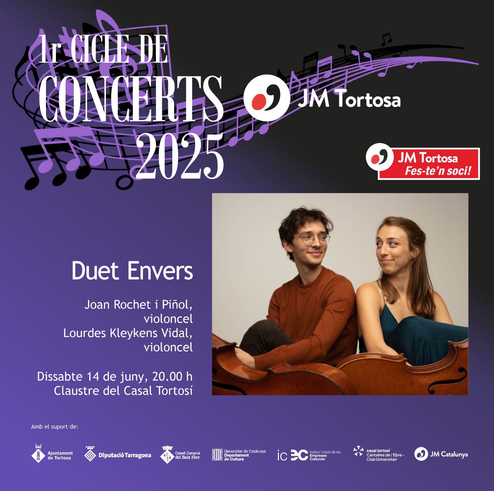 El Duet Envers, format pels violoncel·listes Lourdes Kleykens i Joan Rochet, ens oferiran obres de diferents èpoques, el proper 14 de juny, a les 20:00 hores, al Casal Tortosí.