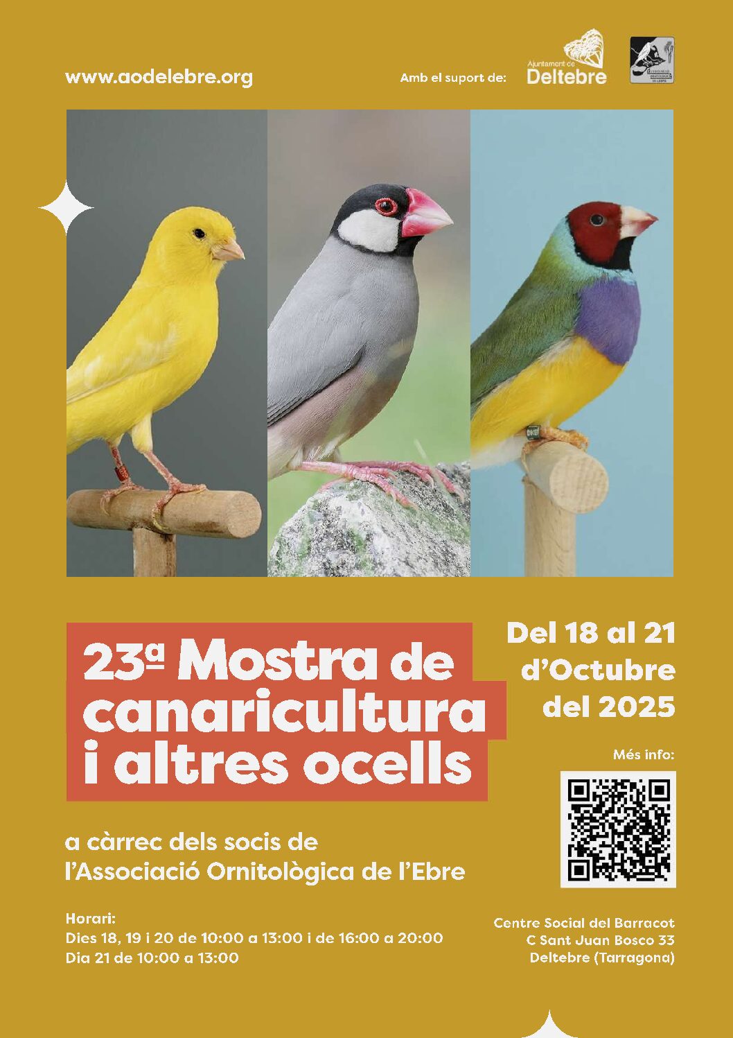 Deltebre tornarà a vibrar amb el cant i els colors dels ocells en la propera edició de la Mostra de Canaricultura i Altres Ocells, organitzada pels socis de L’Associació Ornitològica de l’Ebre, una entitat formada per criadors de les Terres de l’Ebre i del Montsià. L’esdeveniment se celebrarà del 18 al 21 d’octubre de 2025 al Centre Social del Barracot, situat al carrer Sant Joan Bosco, 33. La mostra obrirà les portes al públic en els següents horaris: • 18, 19 i 20 d’octubre: de 10:00 a 13:00 h i de 16:00 a 20:00 h. • 21 d’octubre: de 10:00 a 13:00 h. Durant aquests quatre dies, els visitants podran gaudir d’una exposició única de canaris i altres aus exòtiques, criades amb cura i dedicació pels socis de l’entitat. La passió per l’ornitologia es reflectirà en cada gàbia, acompanyada de cartells informatius amb les especificacions de cada raça, perquè el públic pugui conèixer de prop les seves característiques i particularitats, amb l’objectiu d’oferir una experiència educativa i enriquidora per a tots els visitants. La Mostra promet ser una oportunitat educativa, familiar i molt especial per a tots els amants dels animals i la natura. Un esdeveniment que ja s’ha consolidat com una cita imprescindible en el calendari cultural de Deltebre.