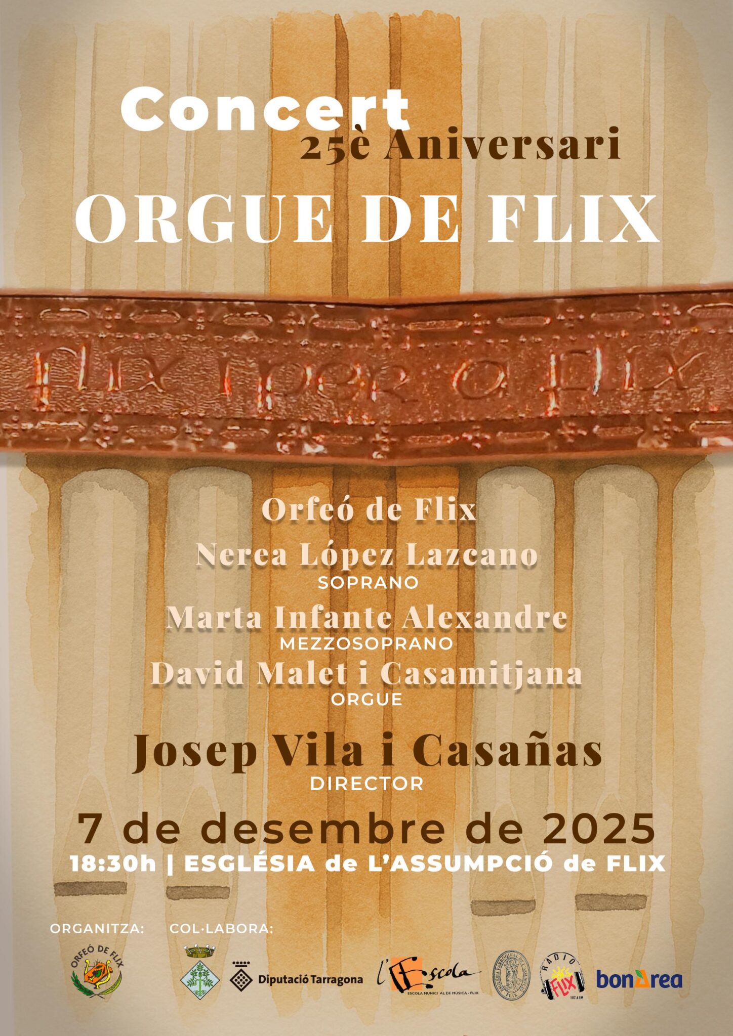Aquest desembre l'església de l'Assumpció de Flix serà l'escenari d'un esdeveniment musical destacat Celebra el 25è Aniversari de l'Orgue de Flix amb un concert commemoratiu que reunirà figures rellevants de la música L'actuació comptarà amb l'Orfeó de Flix la soprano Nerea López Lazcano la mezzosoprano Marta Infante Alexandre David Malet i Casamitjana a l'orgue i tot plegat sota la direcció de Josep Vila i Casañas Una oportunitat única per gaudir de la música clàssica i coral i celebrar el patrimoni musical de la vila de Flix