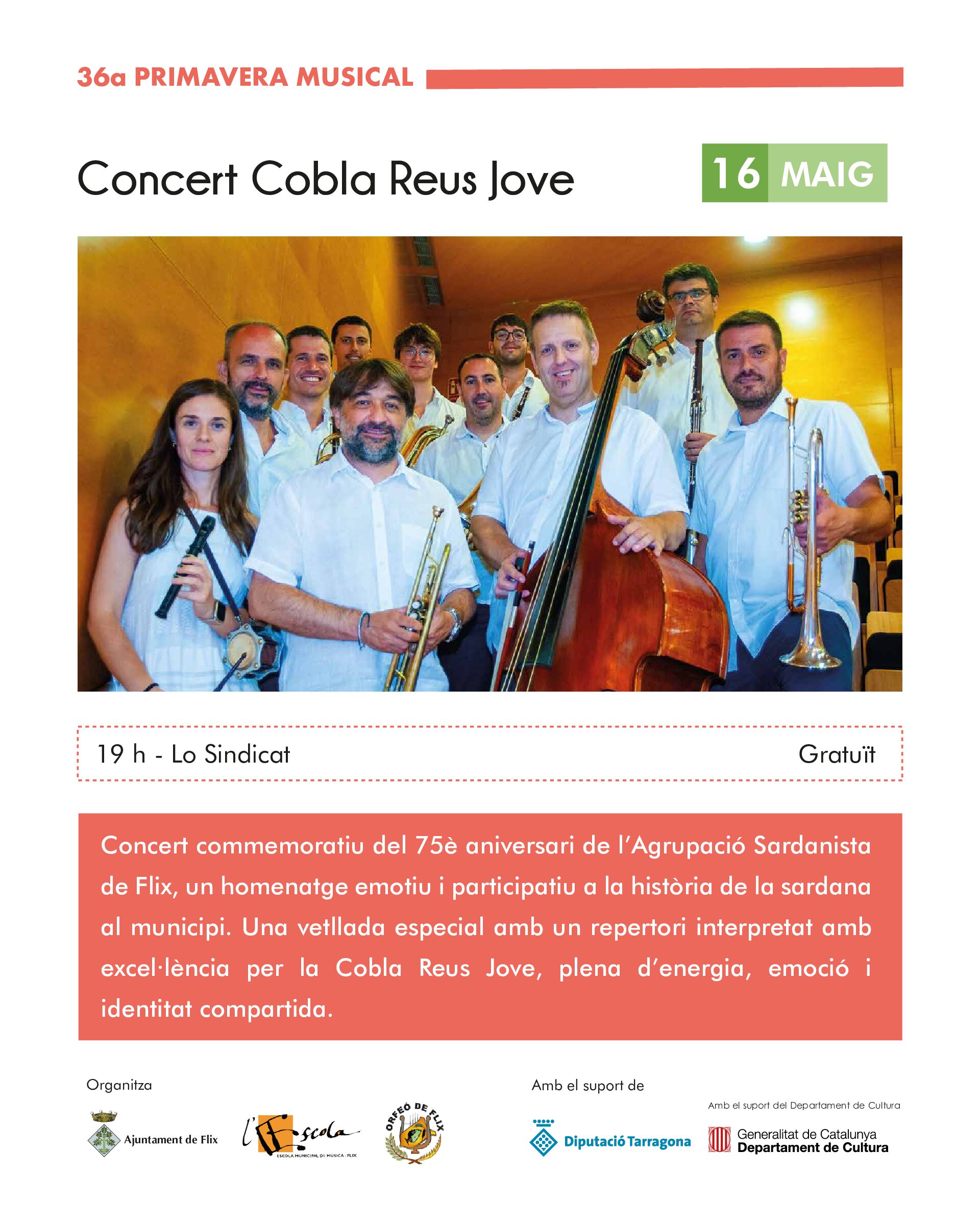 La 36a Primavera Musical de Flix acollirà el 16 de maig el concert de la Cobla Reus Jove, que tindrà lloc a les 19 h a Lo Sindicat i serà gratuït. El concert serà un acte commemoratiu del 75è aniversari de l’Agrupació Sardanista de Flix, convertint-se en un homenatge emotiu a la història i la tradició de la sardana al municipi. La vetllada oferirà un repertori interpretat amb excel·lència per la Cobla Reus Jove, en un concert ple d’energia, emoció i identitat compartida. Aquesta proposta posa en valor la música tradicional catalana i s’emmarca dins la programació cultural de la Primavera Musical de Flix.
