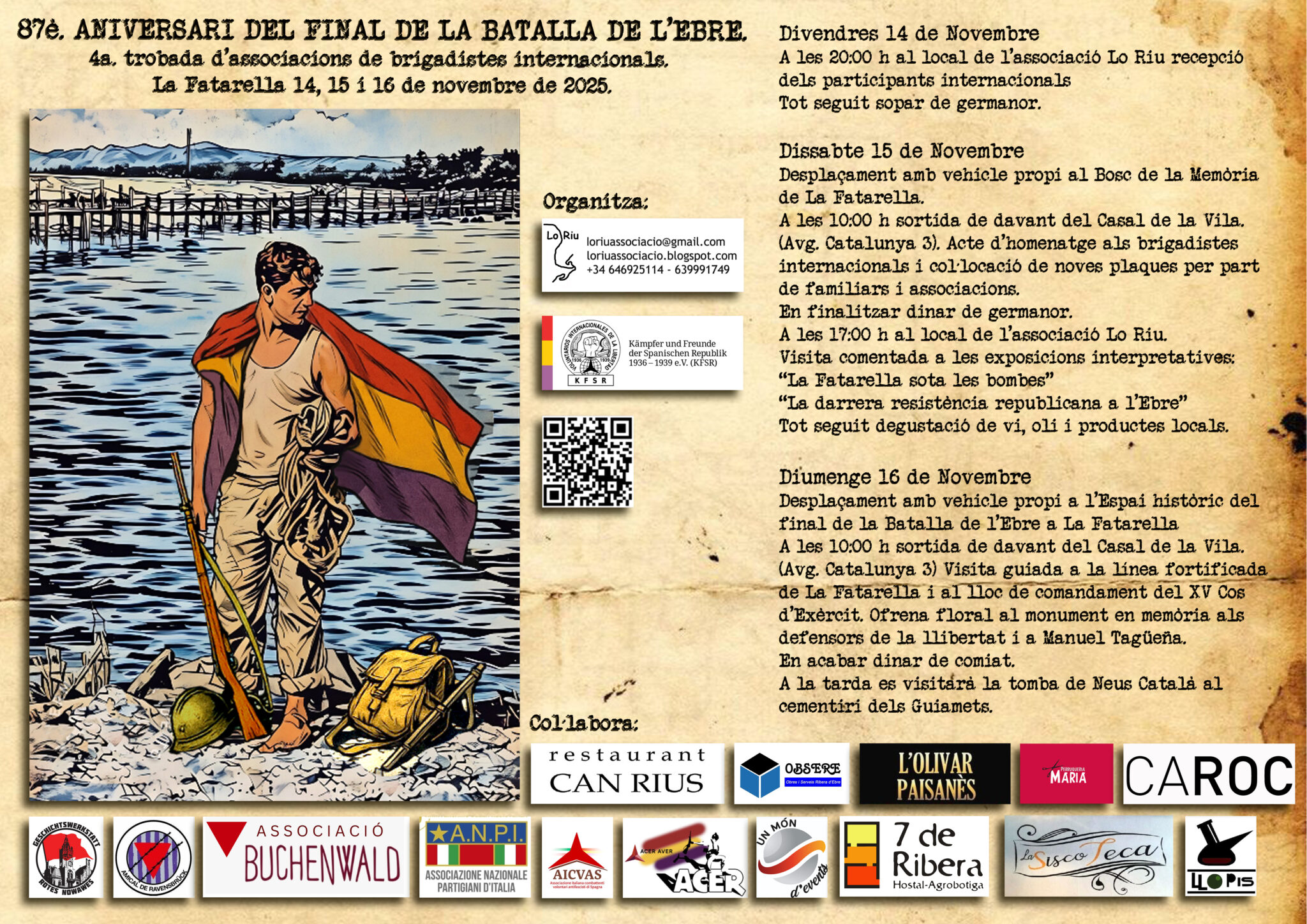 Coincidint amb el cap de setmana del 14, 15 i 16 de novembre, data en què fa 87 anys que va finalitzar la Batalla de l’Ebre, a La Fatarella l’associació Lo Riu i l’associació alemanya KSFR1936-1939 han organitzat un seguit d’actes commemoratius dintre de la 4a trobada d’associacions de brigadistes internacionals.
