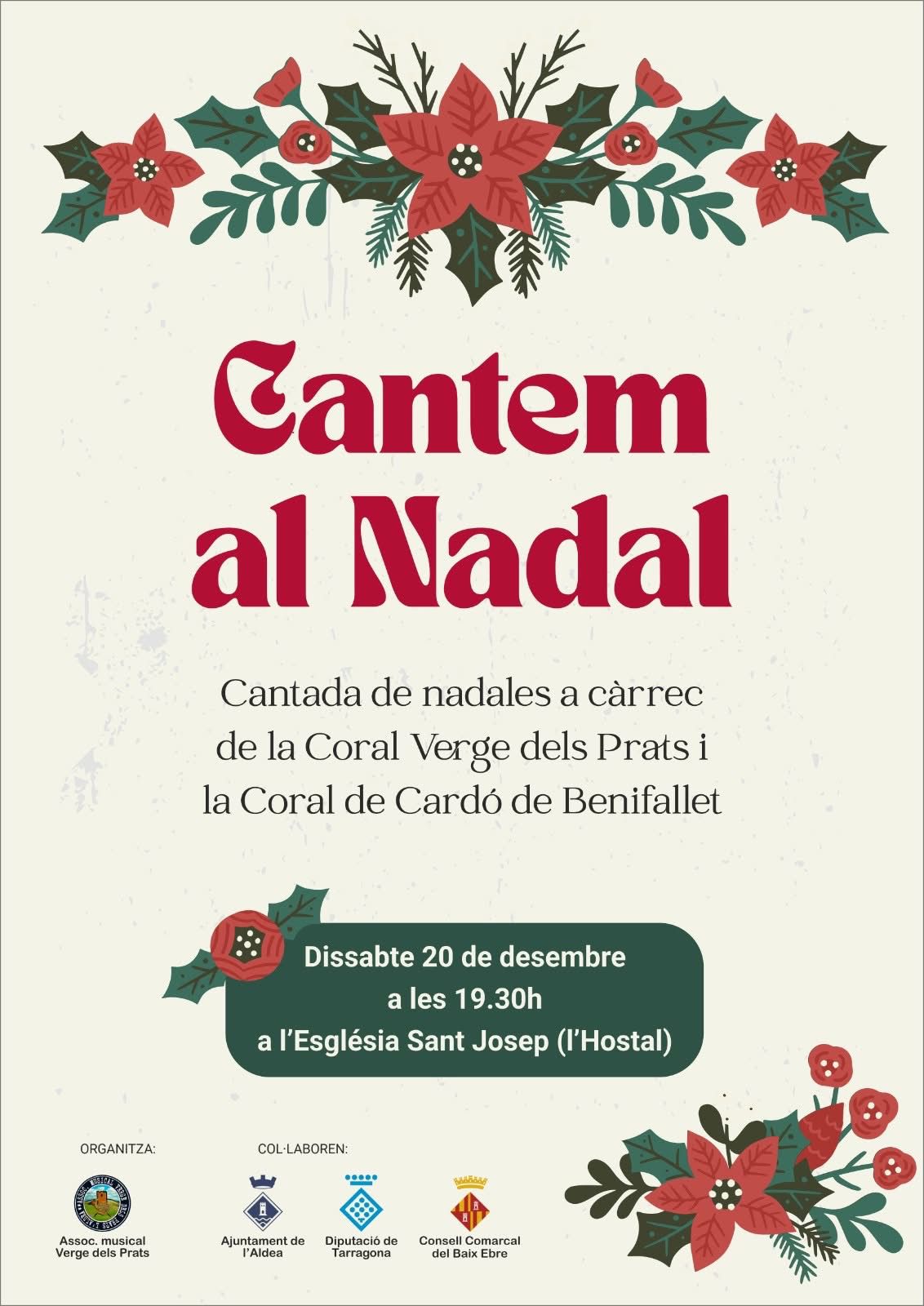 Dissabte 20 de desembre a les 19:30 h a l'Església Sant Josep cantarem al Nadal amb la Coral Verge dels Prats i la Coral de Cardó de Benifallet.