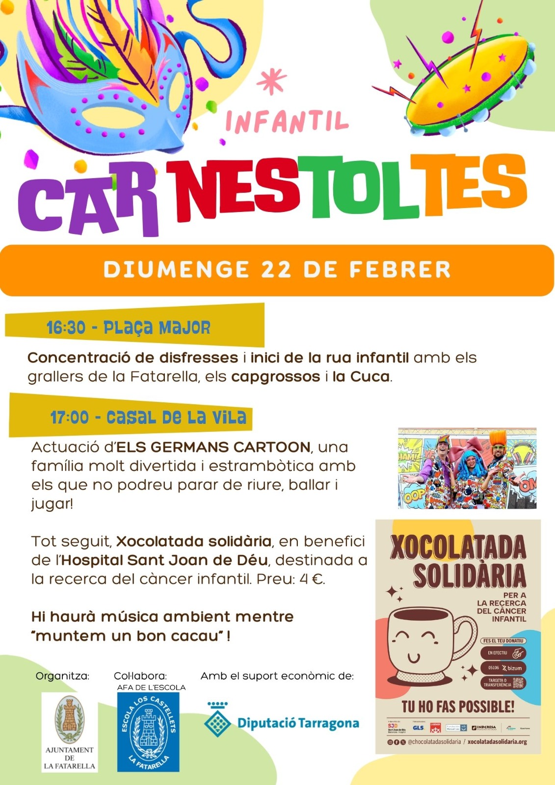 La Fatarella viurà el diumenge 22 de febrer una tarda plena de diversió amb la celebració del Carnestoltes Infantil. La festa començarà a les 16.30 h amb la concentració de disfresses i l’inici de la rua infantil.