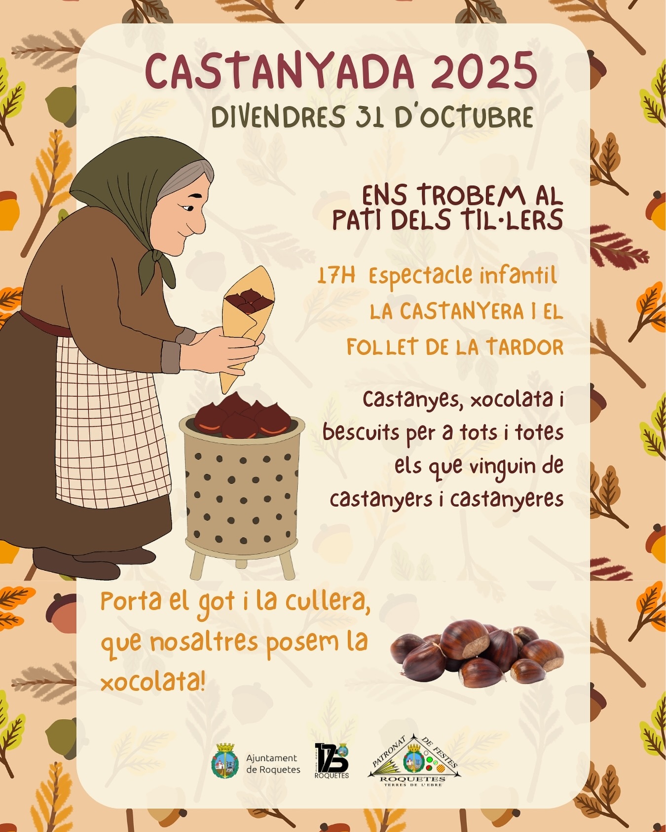 Un dia de tradicions. Els més menuts viuran una festa especial de la Castanyada 2025 a Roquetes, amb un acte infantil el divendres 31 d’octubre, a partir de les 17.00 hores, al Pati dels Til·lers, del Centre Cívic.