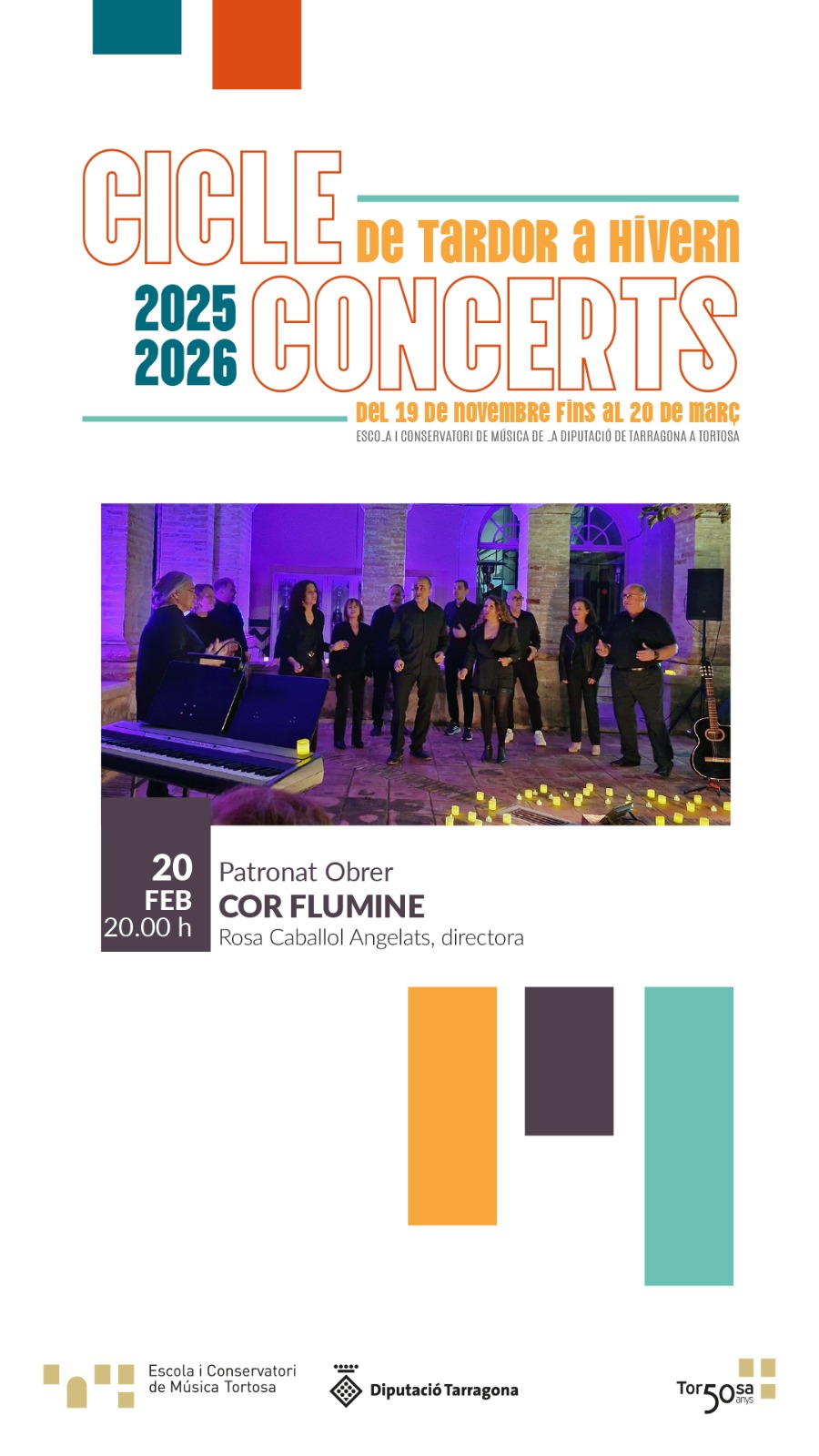El Cicle de Concerts de Tardor a Hivern 2025-2026 s'estendrà del 19 de novembre al 20 de març i es realitzarà a l'Escola i Conservatori de Música de la Diputació de Tarragona a Tortosa. Destaca el concert del 20 de març a les 19:00 h amb el Trio Orfeu —format per Joan Sancho (violí), Jordi Rouré (violí) i Mariona Tuset (violoncel)— que presentarà l'espectacle "PAU, PAU, PAU... LA LLUITA DE PAU CASALS" dins del Patronat Obrer.