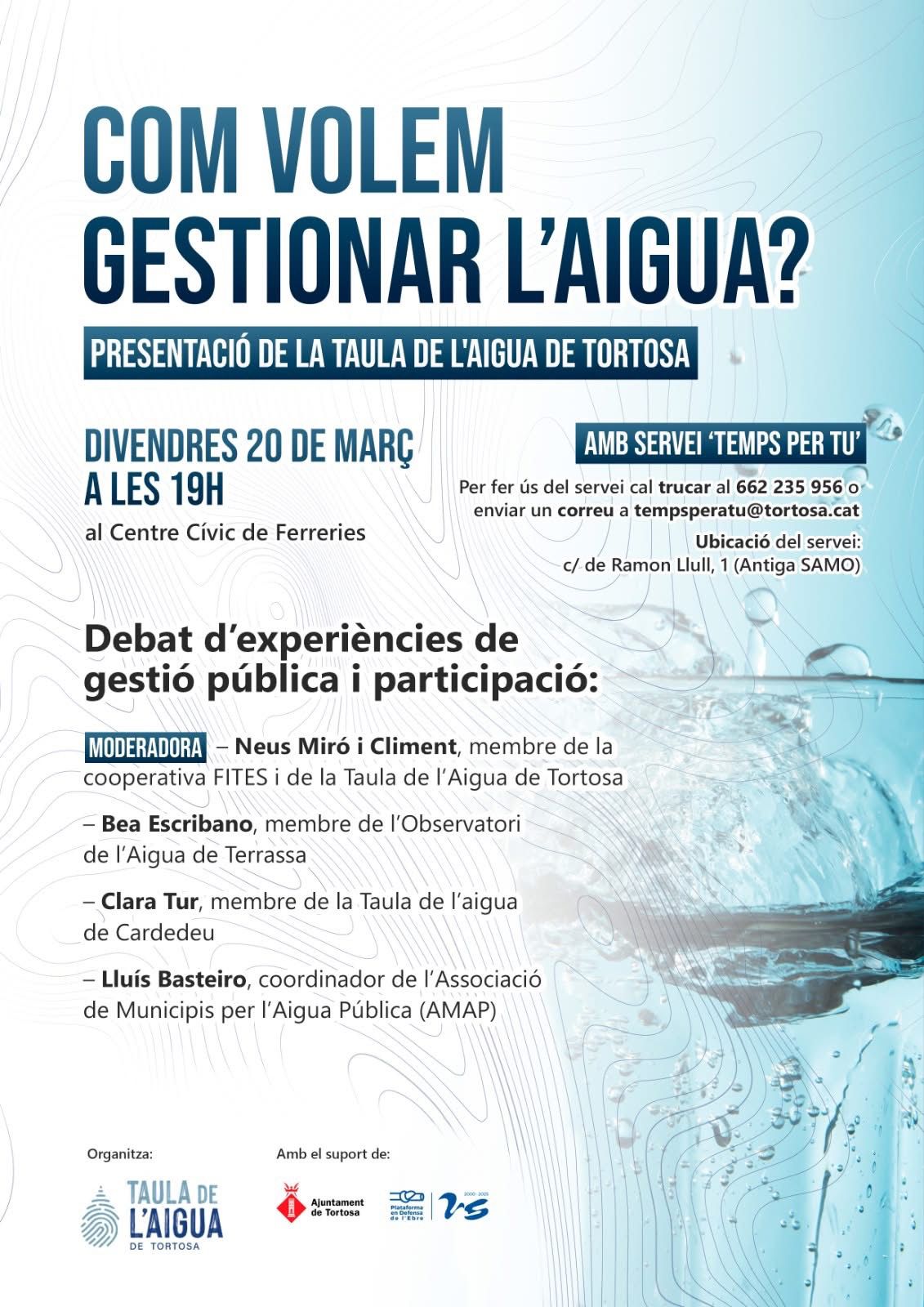 20març19:0020:30Com volem gestionar l’Aigua? Tortosa19:00 - 20:30 Població:Tortosa