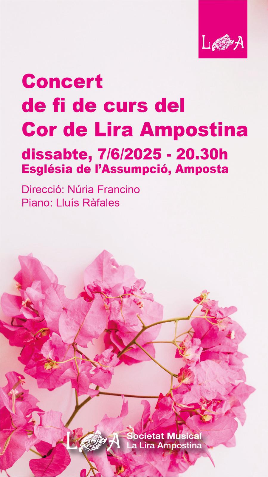 El Cor de Lira Ampostina clou el curs amb un concert a l’Església de l’Assumpció Amposta, juny de 2025 — La Societat Musical La Lira Ampostina es complau a anunciar el concert de fi de curs del Cor de Lira Ampostina, que tindrà lloc el dissabte 7 de juny de 2025 a les 20.30 h a l’Església de l’Assumpció d’Amposta. Sota la direcció de Núria Francino i amb acompanyament al piano de Lluís Ràfales, el concert oferirà una acurada selecció del repertori treballat durant el curs. L’acte suposa una oportunitat única per gaudir del talent local en un entorn tan emblemàtic com l’església de la ciutat. Aquest concert marca la cloenda d’un any ple de música, aprenentatge i emoció, i reafirma el compromís de La Lira Ampostina amb la cultura i la formació musical. L’entrada és lliure fins a completar aforament. ⸻ Per a més informació, contacteu amb: Societat Musical La Lira Ampostina info@laliraampostina.com www.laliraampostina.com