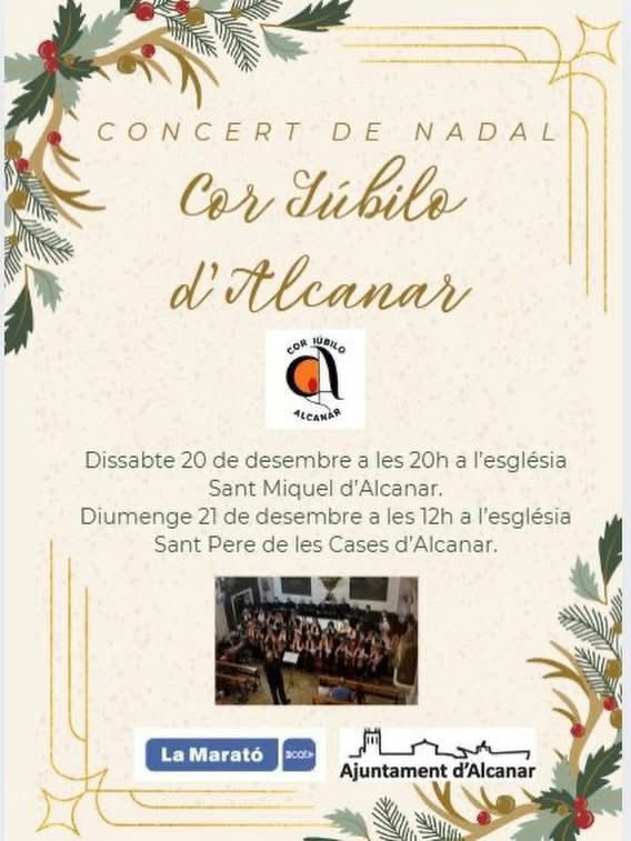 Concert de Nadal a càrrec del Cor Iúbilo d’Alcanar Dissabte, 20 de desembre 20:00 h Església Sant Miquel d’Alcanar Diumenge, 21 de desembre 12:00 h Església Sant Pere de Les Cases d’Alcanar Es podrà col·laborar econòmicament amb La Marató de 3Cat.