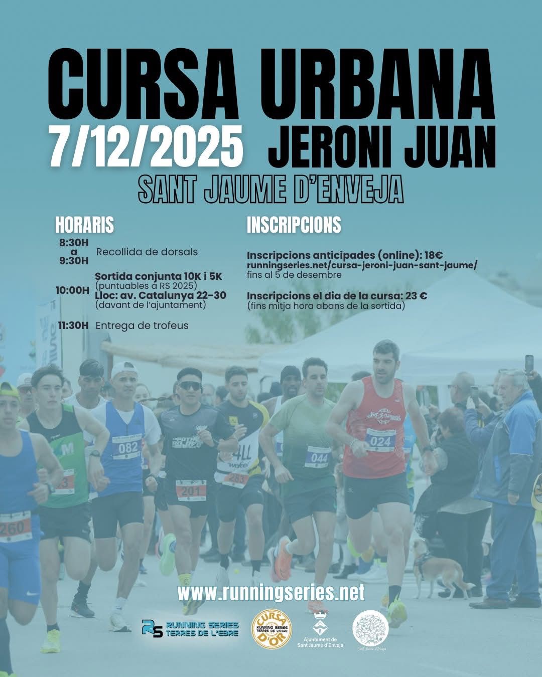 Diumenge, 7 de desembre 10.00h Cursa urbana 5k i 10k 11.30h Entrega de premis Sortida i entrega de premis: plaça de l'Ajuntament de Sant Jaume d'Enveja (Av. Catalunya, 22-30) Inscripcions anticipades fins el dia 5 de desembre a https://www.runningseries.net/calendari/sant-jaume-enveja/ o el mateix dia de la cursa, de 8.30h a 9.30h, al lloc de sortida.