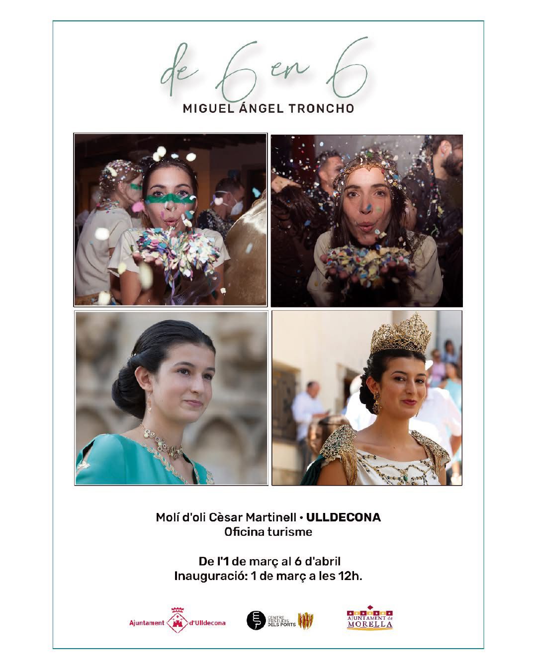El diumenge dia 1 de març a les 12h a l'Oficina de Turisme, s'inaugura l'exposició "De 6 en 6" de Miguel Ángel Troncho. Esta mostra fotogràfica mos acosta a la memòria i tradició d'una festa única com són los quinquennis i sexennis. Vos esperem!