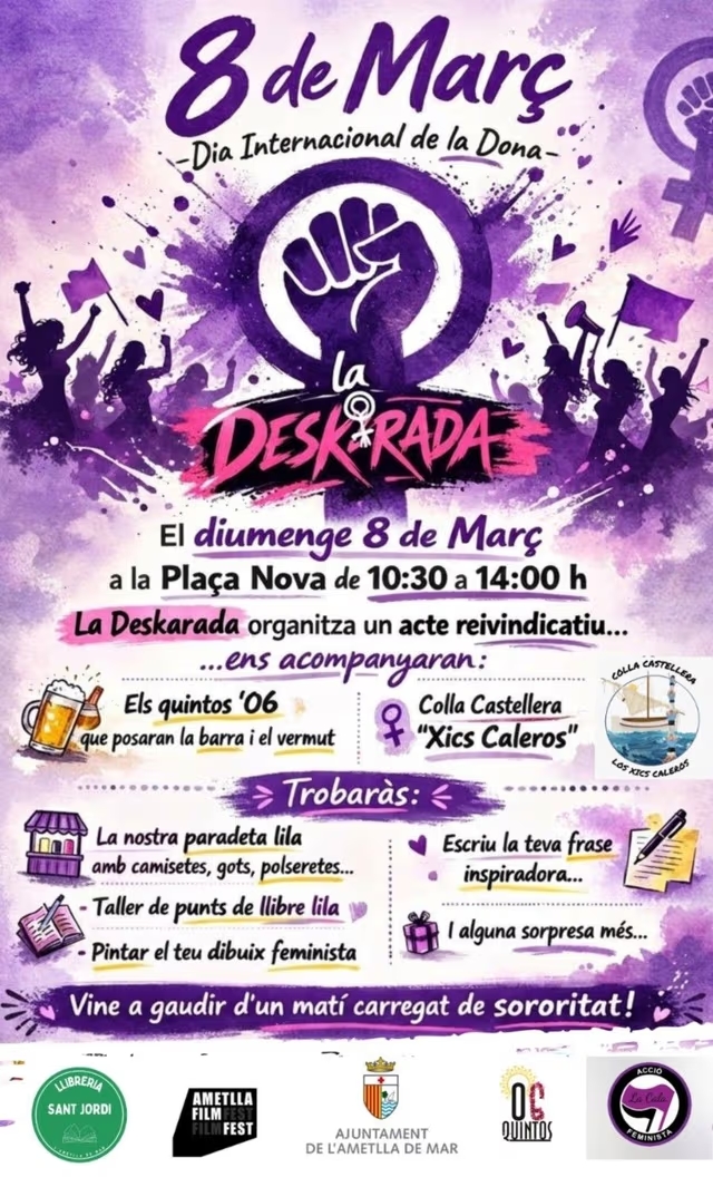 La plaça Nova de l’Ametlla de Mar acollirà el pròxim diumenge 8 de març, de 10.30 a 14.00 h, un acte reivindicatiu amb motiu del Dia Internacional de les Dones.