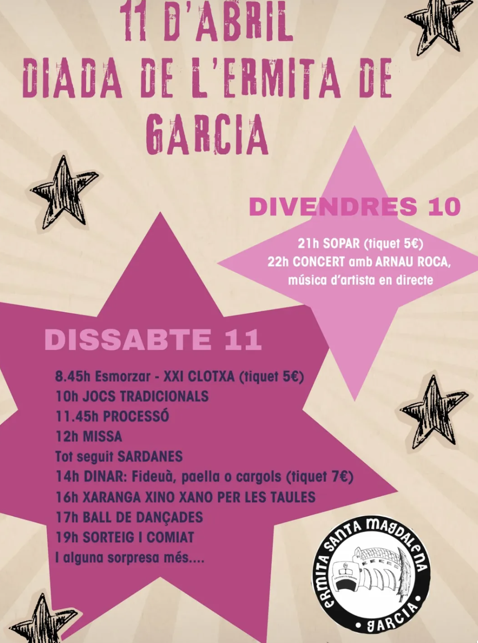 La Diada de l’Ermita de Garcia se celebrarà els dies 10 i 11 d’abril amb un ampli programa d’activitats populars. Divendres a la nit hi haurà sopar i concert amb Arnau Roca, mentre que dissabte es concentraran els actes principals: esmorzar popular, jocs tradicionals, processó, missa i sardanes. La jornada continuarà amb un dinar, música amb xaranga, ball de dansades i sorteig final, en una festa pensada per a totes les edats.