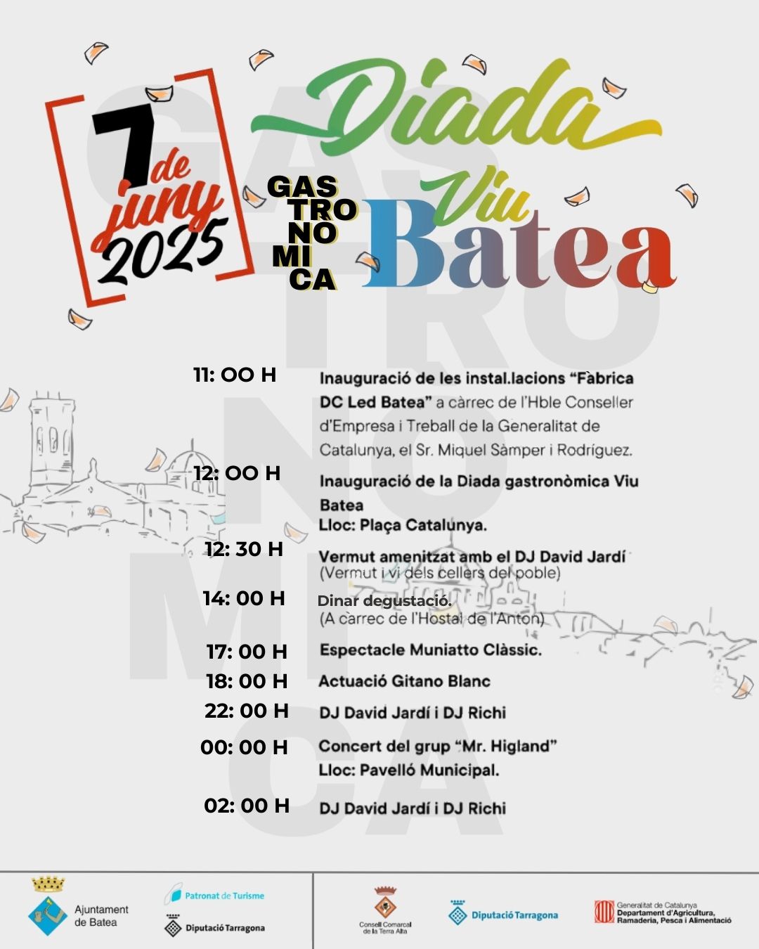 El pròxim dissabte 7 de juny, Batea acollirà la Diada Gastronòmica "Viu Batea", una jornada plena d'activitats culturals, musicals i, sobretot, culinàries. La festa començarà a les 11:00 h amb la inauguració de la fàbrica DC Led Batea i continuarà amb un vermut musical i un dinar degustació. A la tarda i nit, el públic podrà gaudir d'espectacles i actuacions de Gitano Blanc, el grup Mr. Higland i sessions de DJ David Jardí i DJ Richi fins a altes hores de la matinada. L'esdeveniment tindrà lloc principalment a la Plaça Catalunya i al Pavelló Municipal.