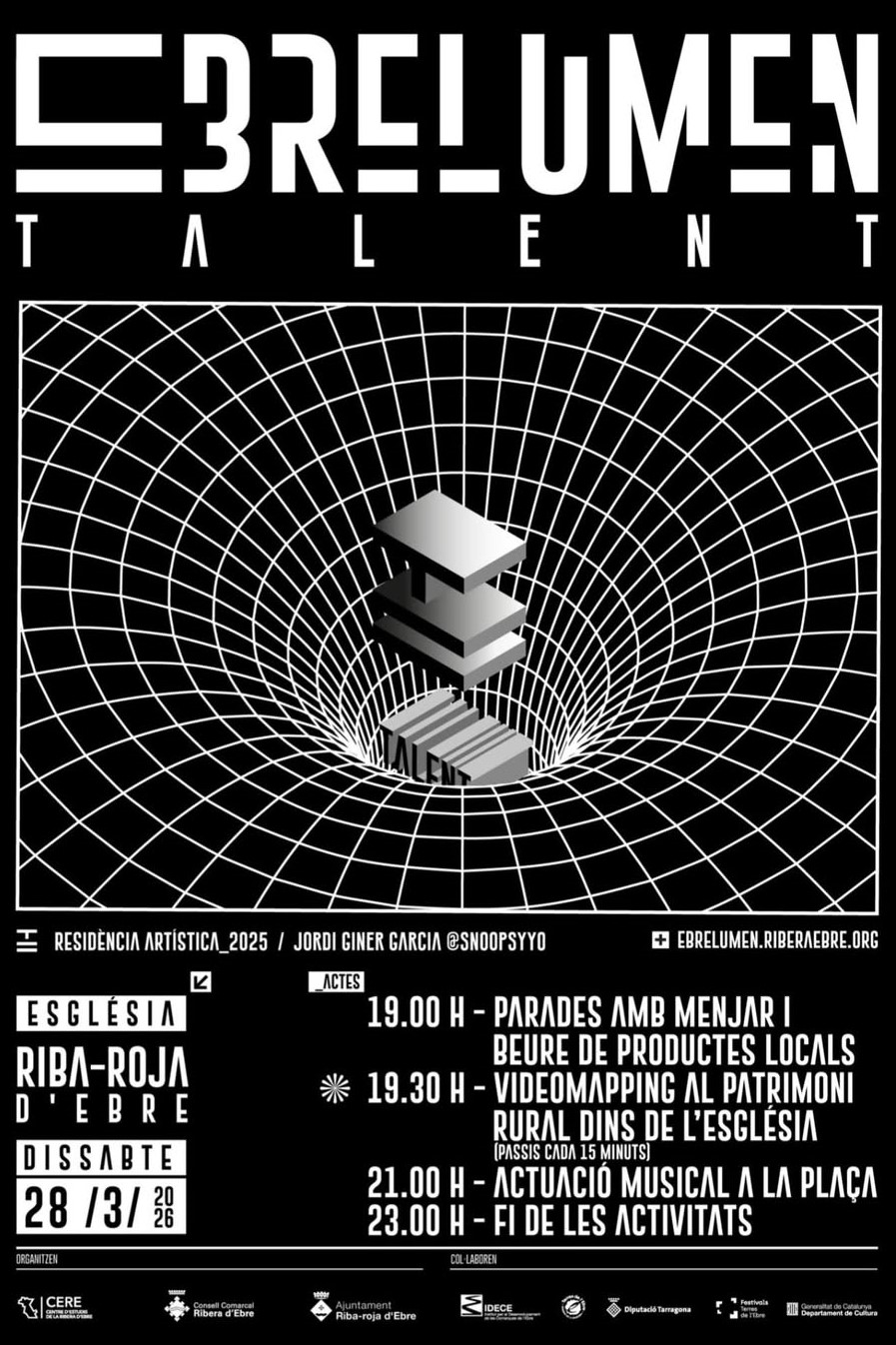 28març19:0023:00EBRELUMEN TALENT a Riba-roja d’Ebre19:00 - 23:00 Població:Riba-roja d'Ebre