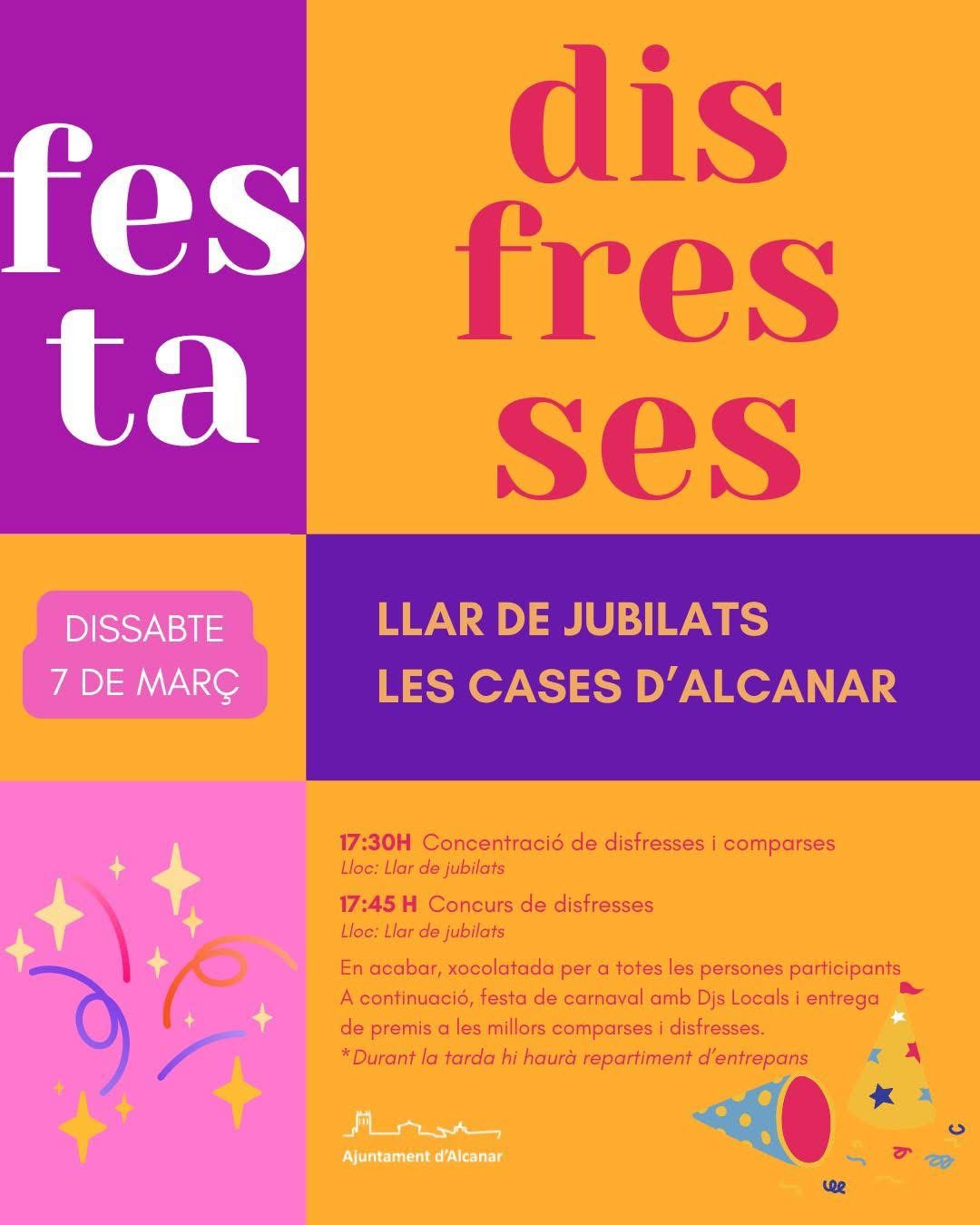 El Carnaval de les Cases d'Alcanar torna! Dissabte, 7 de març 17:30 h • Concentració a la Llar de jubilats 17:45 h • Rua de Carnaval pels carrers (si la meteorologia ho permet) Xocolatada Festa de Carnaval amb Djs locals Entrega de premis Viu una tarda de disfresses, comparses, bon rotllo i molta gresca!