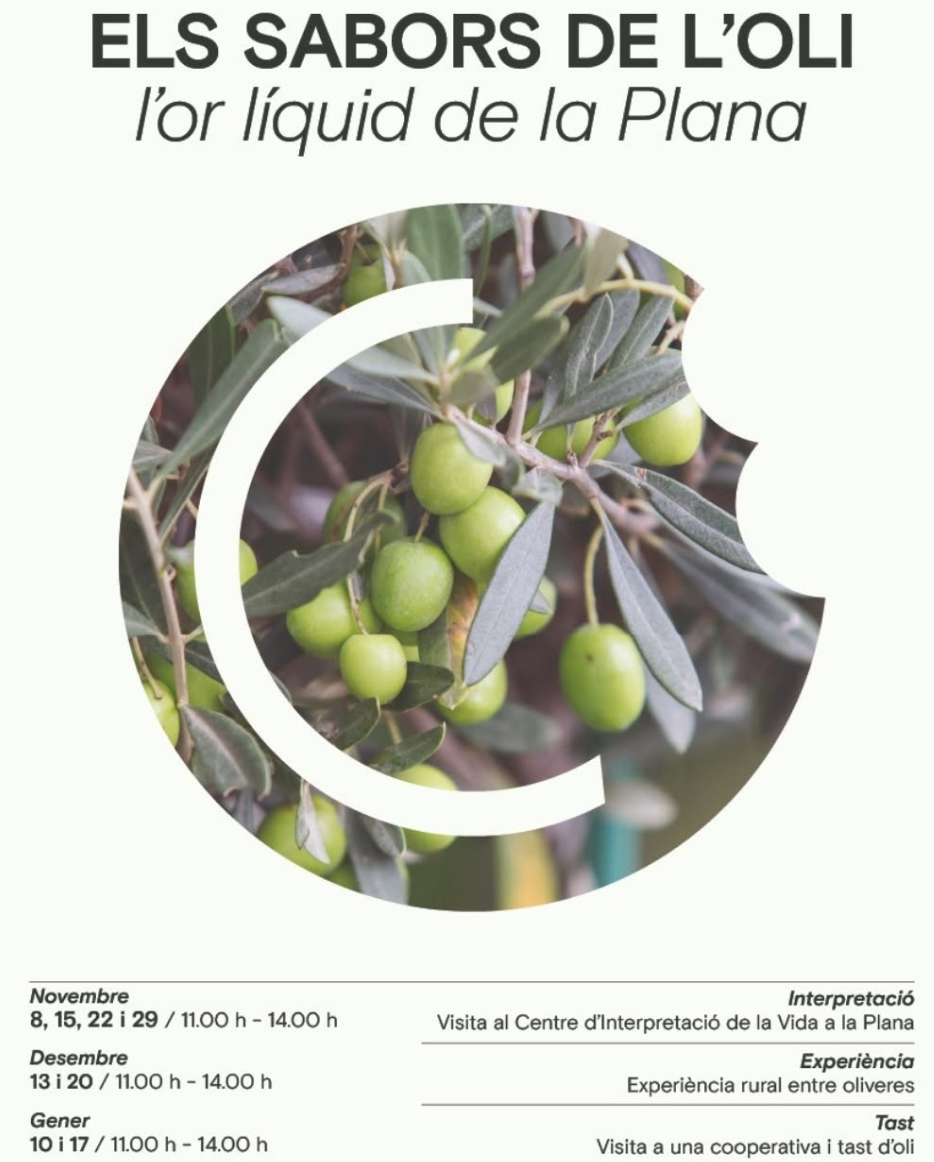 15nov(nov 15)11:0017gen(gen 17)14:00Els sabors de l’oli, l’or líquid de la Plana(novembre 15) 11:00 - (gener 17) 14:00 Població:Santa Bàrbara