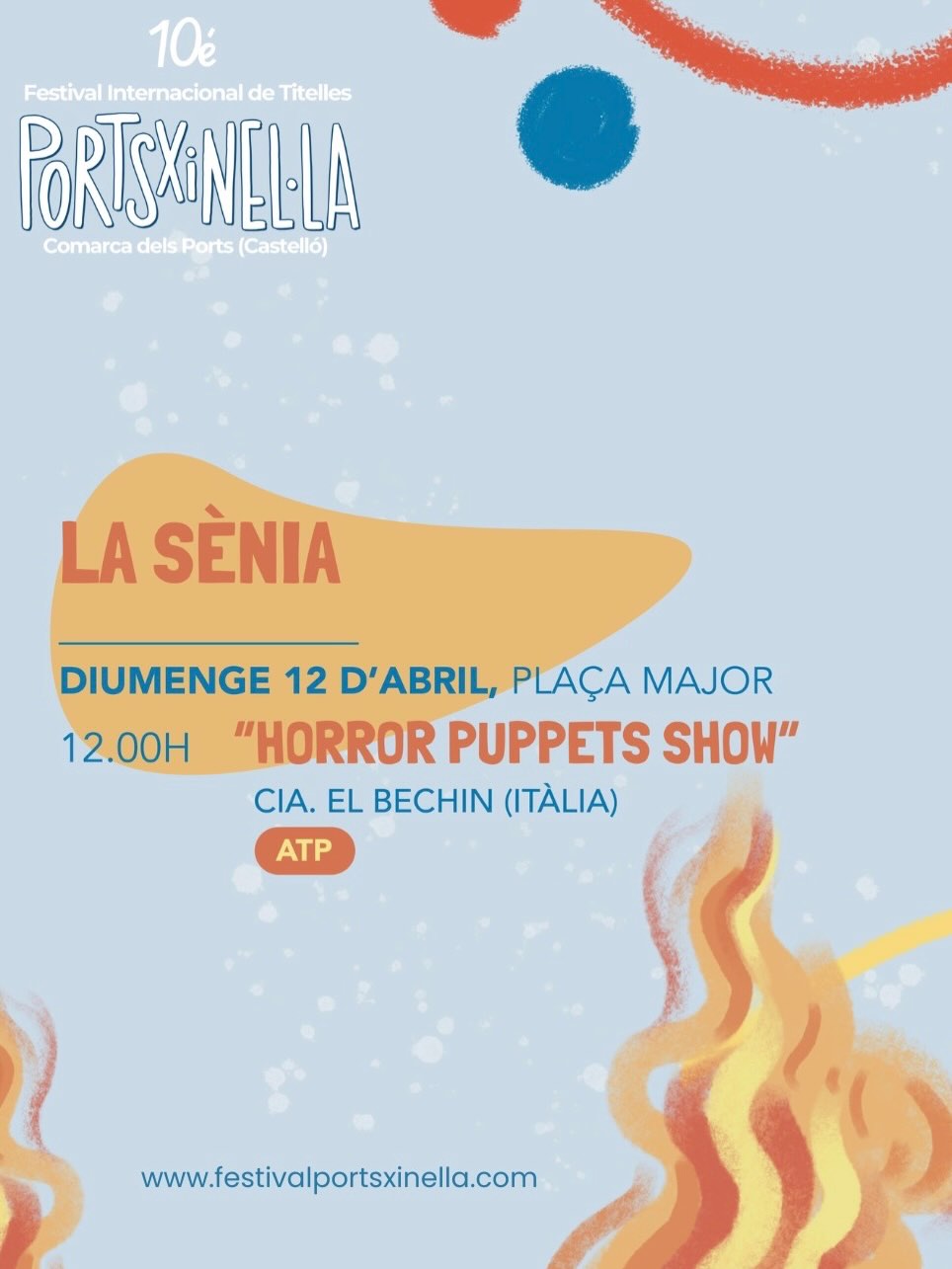 El pròxim diumenge 12 d’abril, la Plaça Major de la Sénia acollirà un espectacle sorprenent dins del Festival Internacional de Titelles Portsxinel·la. A les 12.00 h, la companyia italiana El Bechin presentarà “Horror Puppets Show”, una proposta irreverent on els personatges de terror cobren vida amb humor, música i molt de joc amb els titelles.