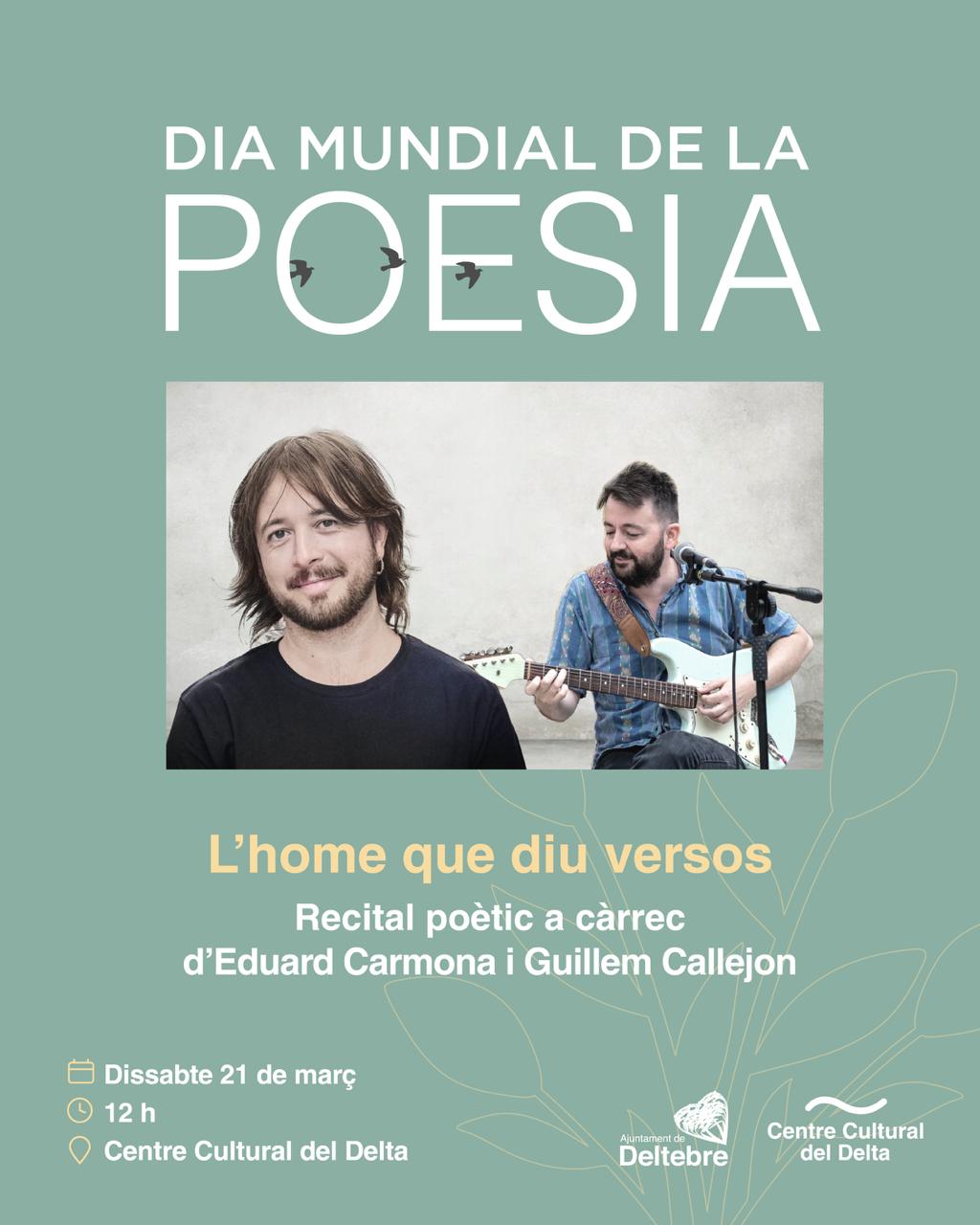 El Centre Cultural del Delta acollirà aquest dissabte, coincidint amb el Dia Mundial de la Poesia, l’espectacle L’home que diu versos, una proposta que fusiona poesia i música en directe amb Eduard Carmona i Guillem Callejon.