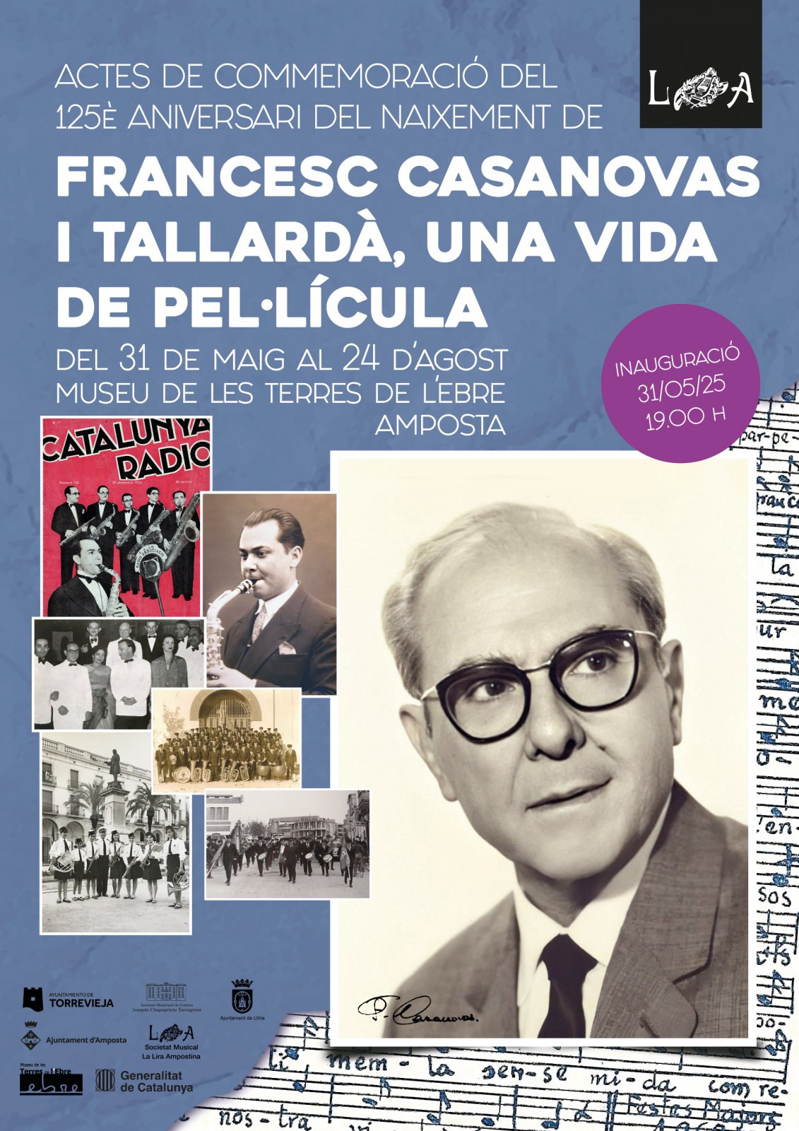 El Museu de les Terres de l’Ebre acollirà una exposició itinerant sobre la vida i obra del mestre Francesc Casanovas, qui va ser director de la Lira als anys 60, impulsant la participació de dones en la música de banda, la banda juvenil o l’orfeó de la Lira. La mostra, que es podrà veure del 31 de maig al 24 d’agost al Museu, compta amb la col·laboració de la Lira i l’Ajuntament d’Amposta, i s’inaugurarà el dissabte, 31 de maig a les 19 hores, amb la participació de la banda de música de la Lira.