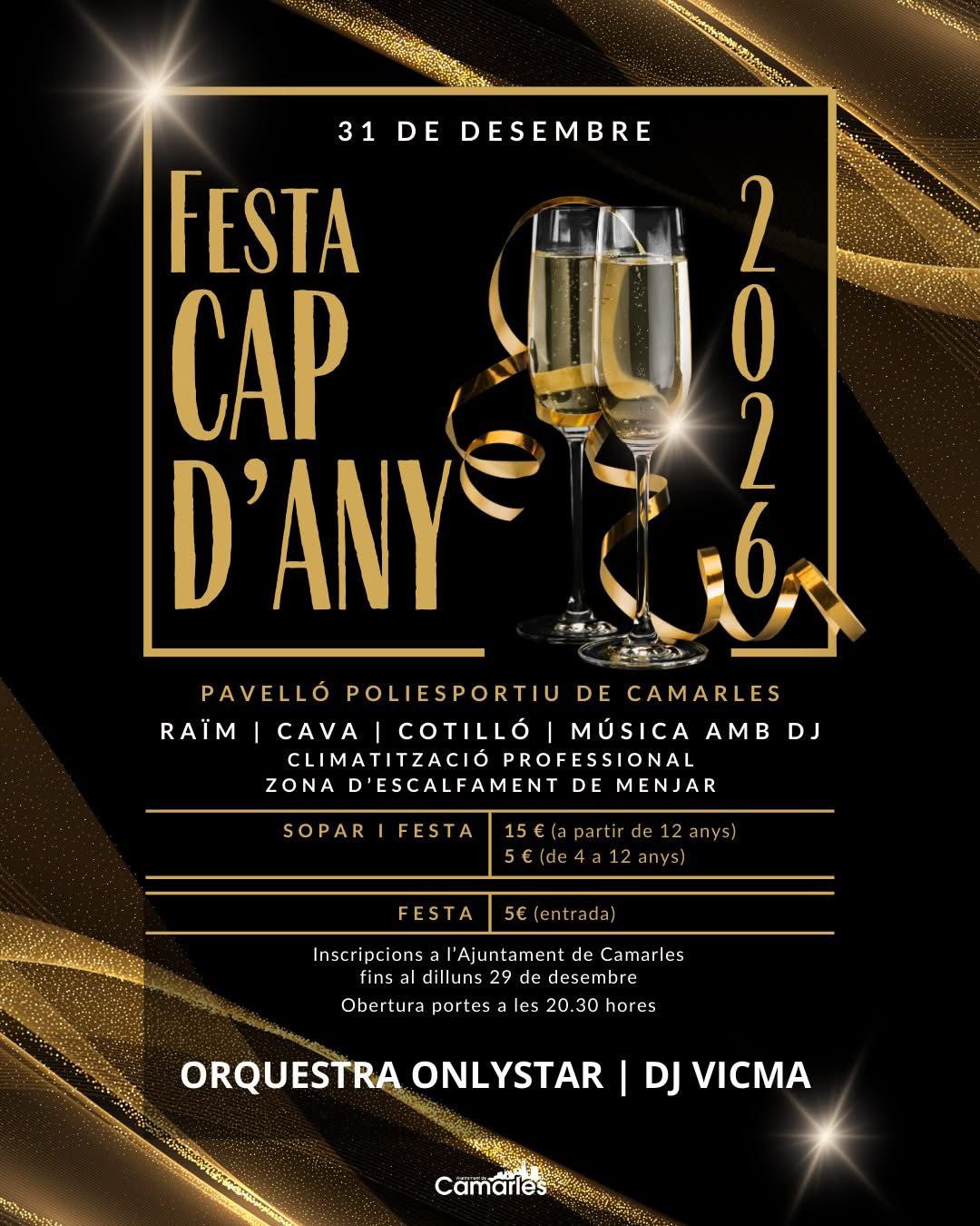 Celebrem l’arribada del 2026 a Camarles! Aquest 31 de desembre, us convidem a donar la benvinguda al nou any amb una gran Festa de Cap d’Any al Pavelló Poliesportiu de Camarles. Una
