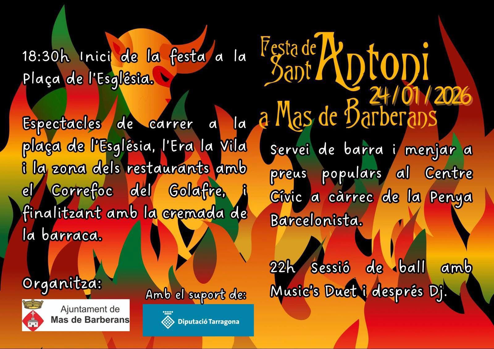 FESTA DE SANT ANTONI 2026 Mas de Barberans Data: 24 de gener de 2026 Lloc i Hora: 18.30 h – Inici de la festa a la Plaça de l’Església Actes: Espectacles de carrer a