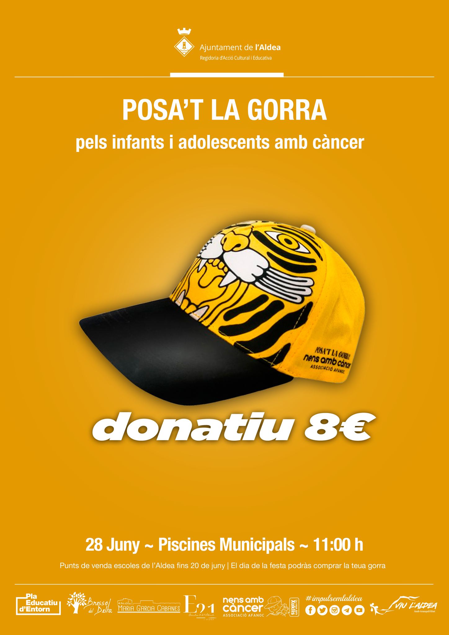 El pròxim 28 de juny a les 11:00 h, vine a gaudir de la festa solidària “Posa’t la Gorra” a les piscines municipals de l’Aldea!