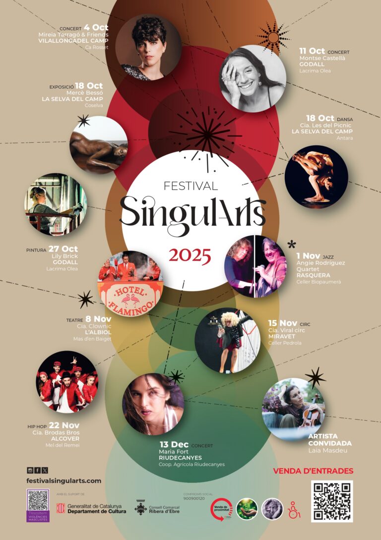El Festival SingulArts 2025 torna a les comarques de Tarragona, Ribera d’Ebre i Montsià amb una segona edició que se celebrarà del 4 d’octubre al 13 de desembre. El certamen uneix cultura, música, teatre i dansa amb tastos de productes de proximitat com el vi, l’oli, la mel i l’avellana.