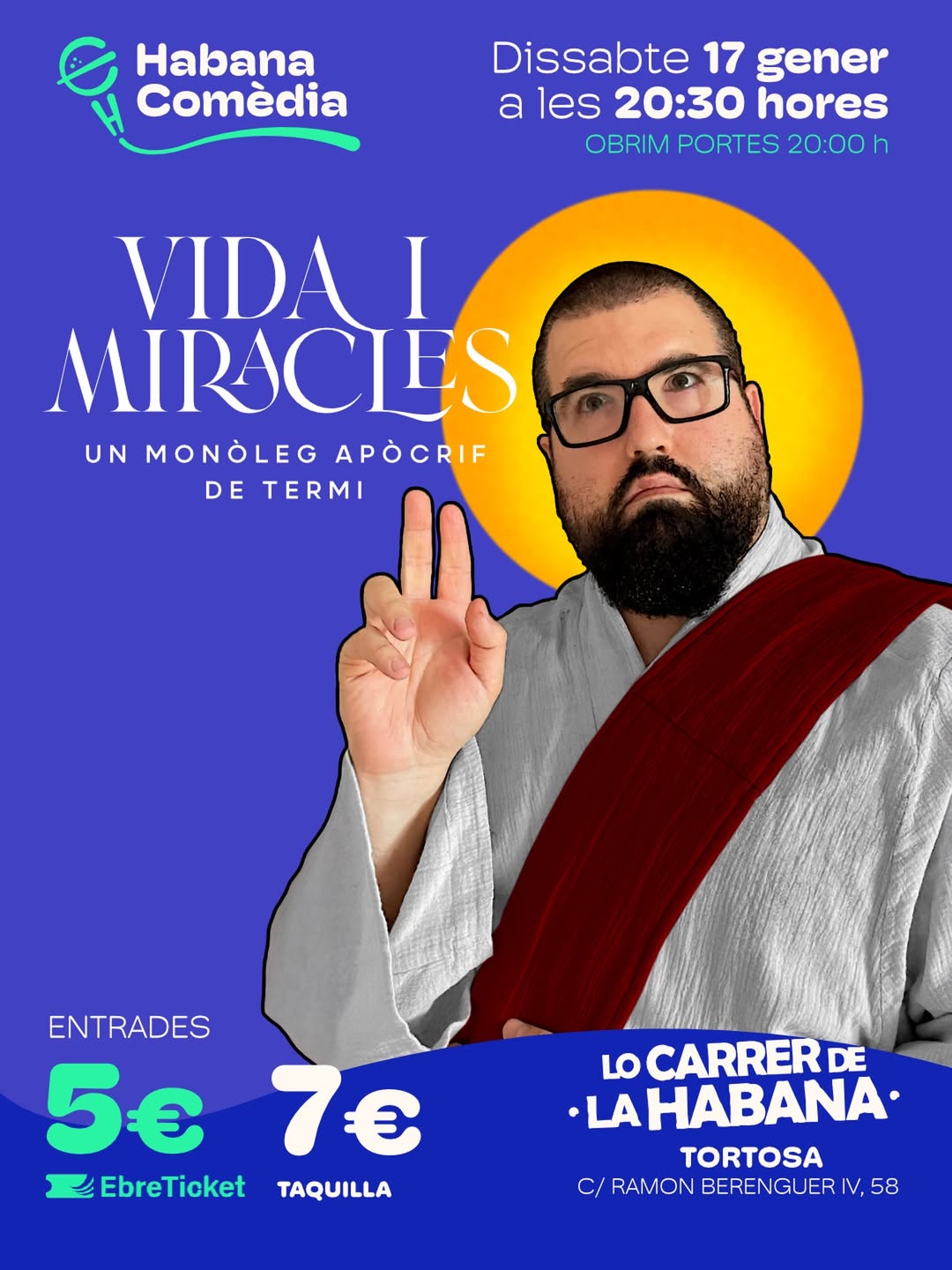 Termi repassa els seus orígens, la família, els estudis, la feina, la vida sentimental i com està vivint la paternitat i fer-se gran en un món hostil i canviant. Entrades a: https://ebreticket.cat/esdeveniments/monoleg-vida-i-miracles-habana-comedia-17-01-2026/