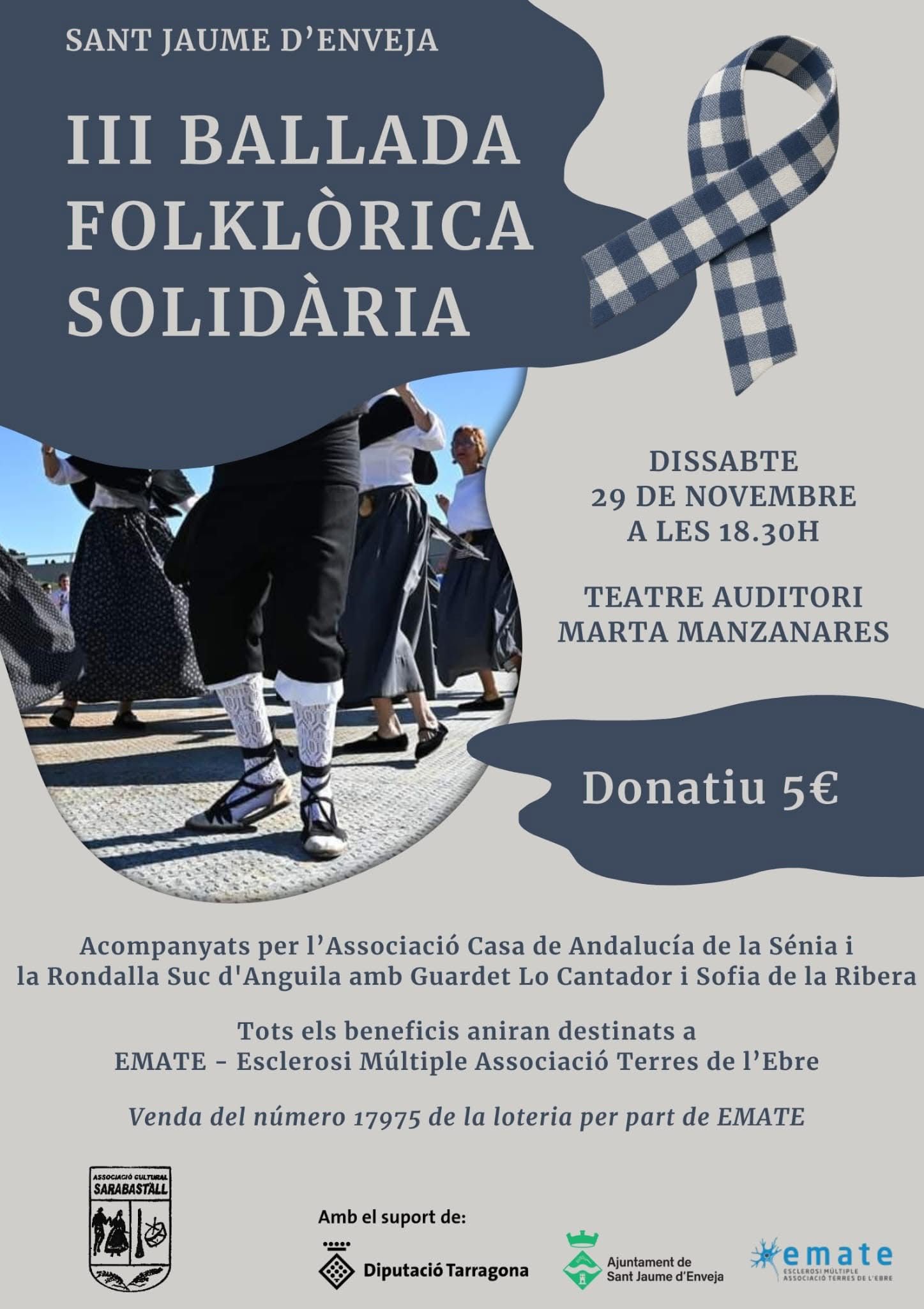 Dissabte, 29 de novembre, el Teatre Auditori Marta Manzanares de Sant Jaume d'Enveja acollirà la III Ballada folklòrica solidària. Les persones que vulguin col•laborar i assistir a l'acte benèfic, organitzat per l'Associació Cultural i de Folklore Tradicional Sarabastall, hauran d'aportar un donatiu de 5€. Una tarda de ball i folklore destinada a EMATE, Esclerosi Múltiple Associació Terres de l'Ebre.