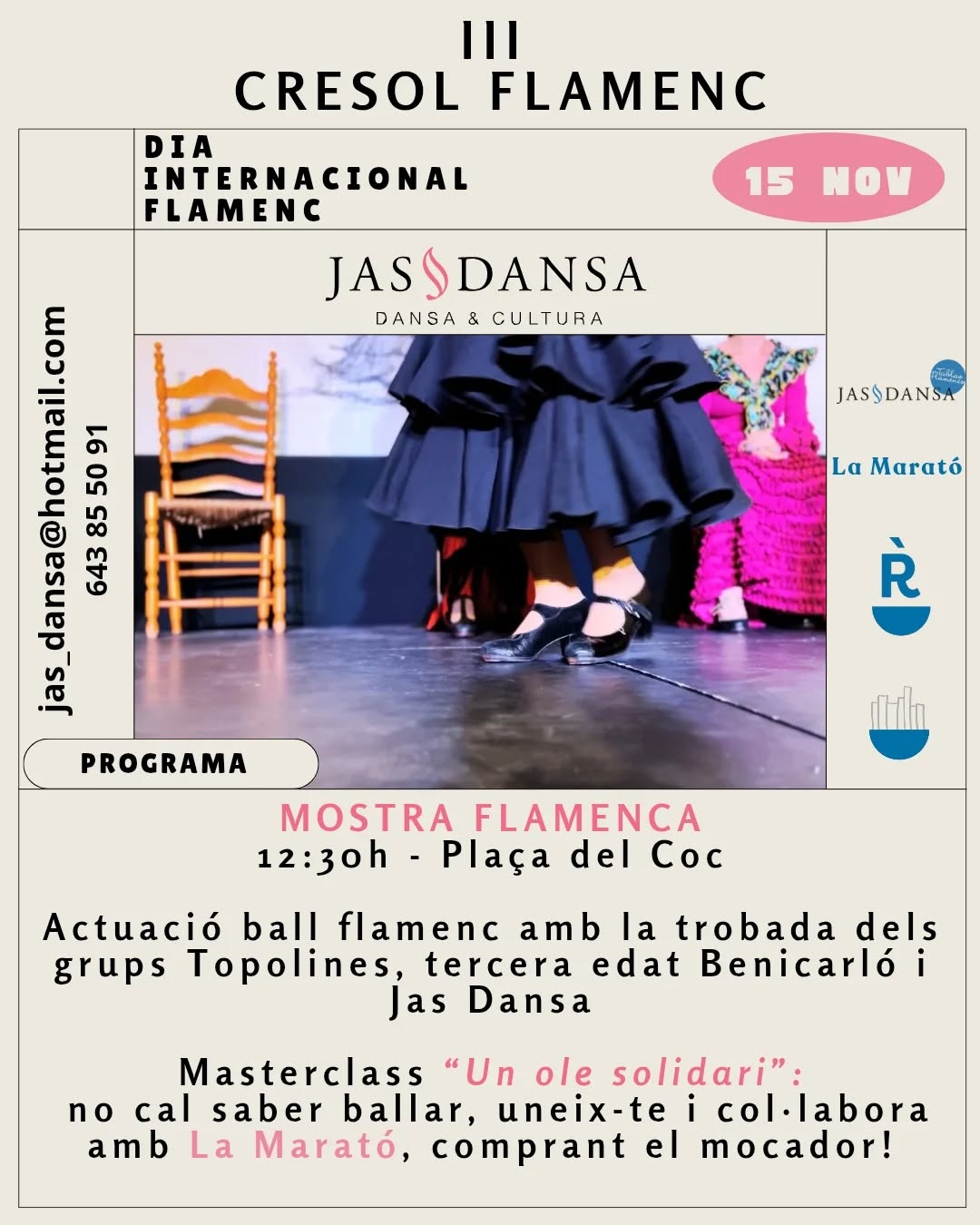 El pròxim 15 de novembre, se celebra el Dia Internacional del Flamenc amb el III Cresol Flamenc organitzat per Jas Dansa - Dansa & Cultura. Durant el matí es realitzarà una mostra Flamenca i Masterclass "Un Ole solidari" a les 12:30 a la Plaça del Coc. La jornada inclou també actuacions dels grups Topolines, tercera edat Benicarló i Jas Dansa. La Masterclass Solidària ("no cal saber ballar!") és un acte de col·laboració amb La Marató, on es pot participar i ajudar comprant el mocador.