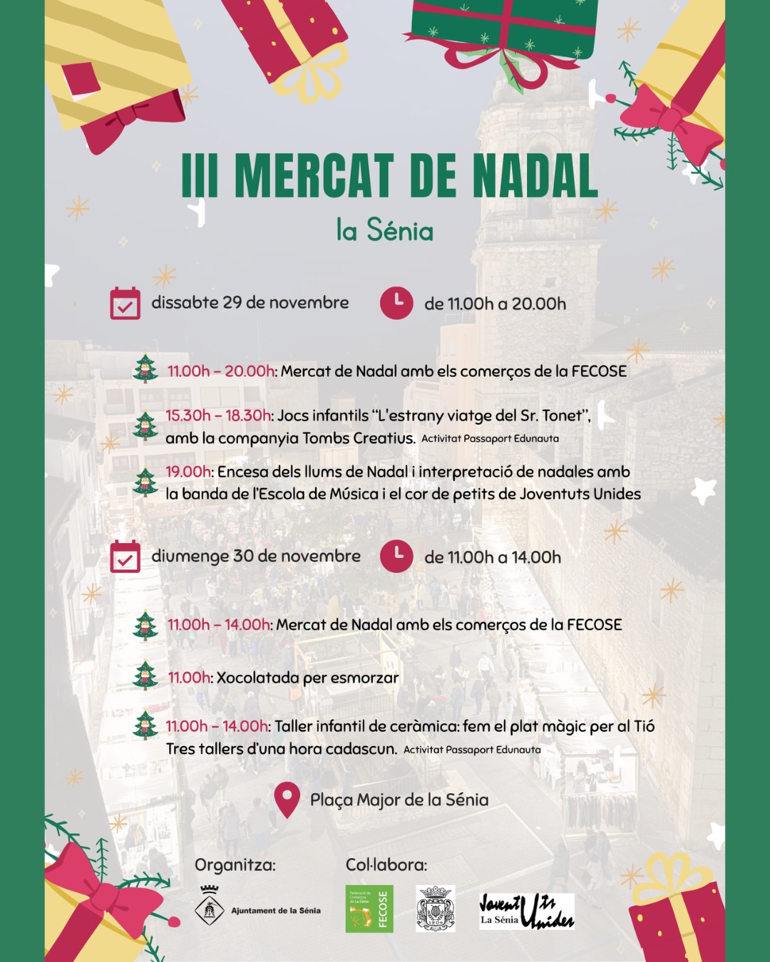 Arriba el III Mercat de Nadal a La Sénia els pròxims 29 i 30 de novembre a la Plaça Major. Durant aquests dos dies, els visitants podran gaudir de comerços locals, xocolatada popular, nadales i l’encesa de llums, així com tallers i activitats infantils i espectacles familiars. Una cita plena d’ambient nadalenc i molta il·lusió!