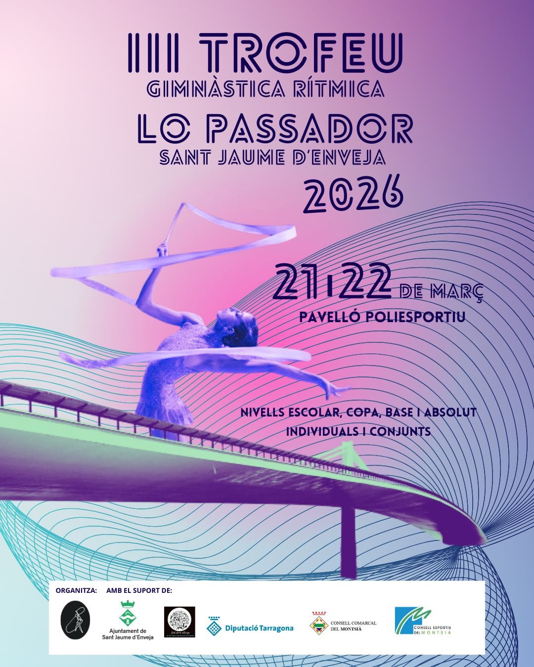 Els dies 21 i 22 de març, Sant Jaume d’Enveja es convertirà en el centre de la gimnàstica rítmica amb la celebració del 3r Trofeu Lo Passador. Durant tot el cap de setmana, el Pavelló Poliesportiu acollirà més de 800 gimnastes vingudes de Catalunya, Andorra i la Comunitat Valenciana, competint en tots els nivells, des d’escolar fins a absolut, tant en individuals com en conjunts. Un esdeveniment que ja és tot un èxit i que any rere any continua creixent. Com a novetat destacada, el dissabte 21 de març a la tarda comptarem amb la presència d’una gimnasta internacional, que oferirà una masterclass exclusiva i una exhibició especial. Us esperem per viure un cap de setmana ple d’esport, talent i emoció. No us ho perdeu!