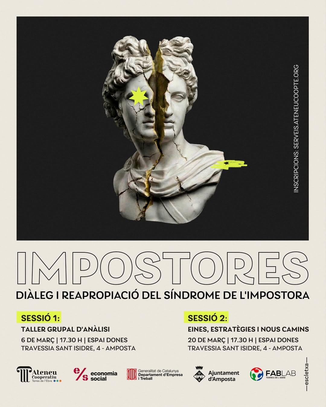 L’Espai Dones d’Amposta acollirà aquest mes de març el procés participatiu “Impostores. Diàleg i reapropiació del síndrome de la impostora”, una proposta que convida a reflexionar col·lectivament sobre aquesta vivència i a transformar-la en eines de creixement personal i comunitari.