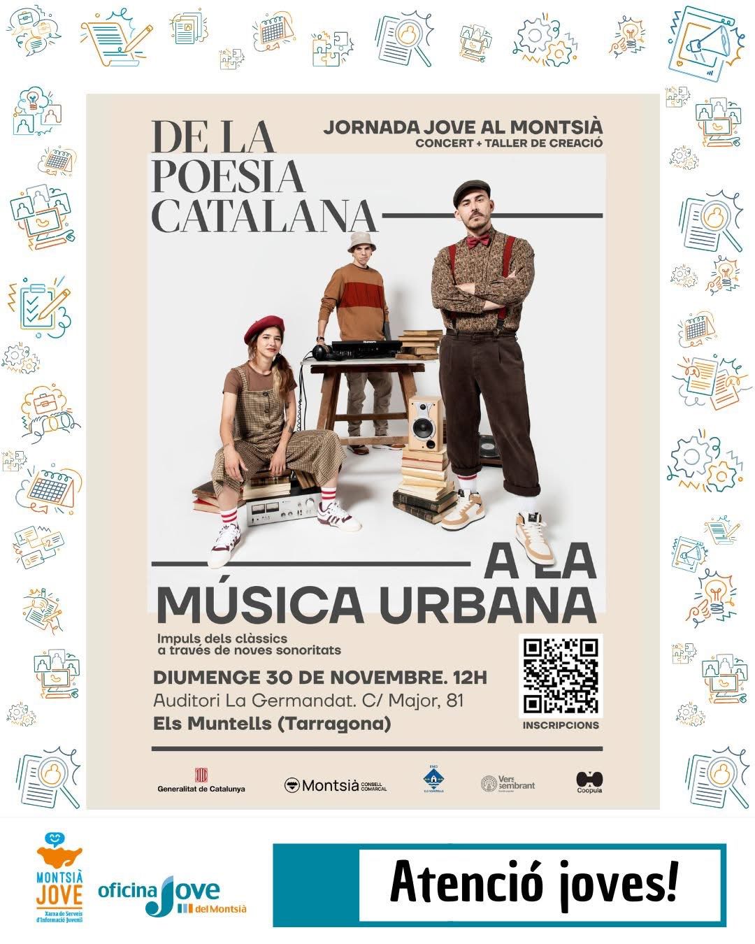 Vols viure una experiència única on els versos clàssics es converteixen en ritmes actuals? Vine al concert, queda’t a dinar i participa als tallers on crearàs la teva pròpia cançó! Diumenge 30 de novembre Els Muntells (Tarragona) Auditori La Germandat. C/ Major, 81 12h – Concert que t’encendrà l’energia 13h – Taller creatiu per transformar poesia en música 14:30h – Dinar de pa i porta compartit 15h a 18h – Gravem la teva pròpia adaptació poètica! Vine a crear, a sentir i a fer sonar la teva veu! Apunta-t’hi ja! Enllaç al QR del cartell o https://scur.cat/Z67A06