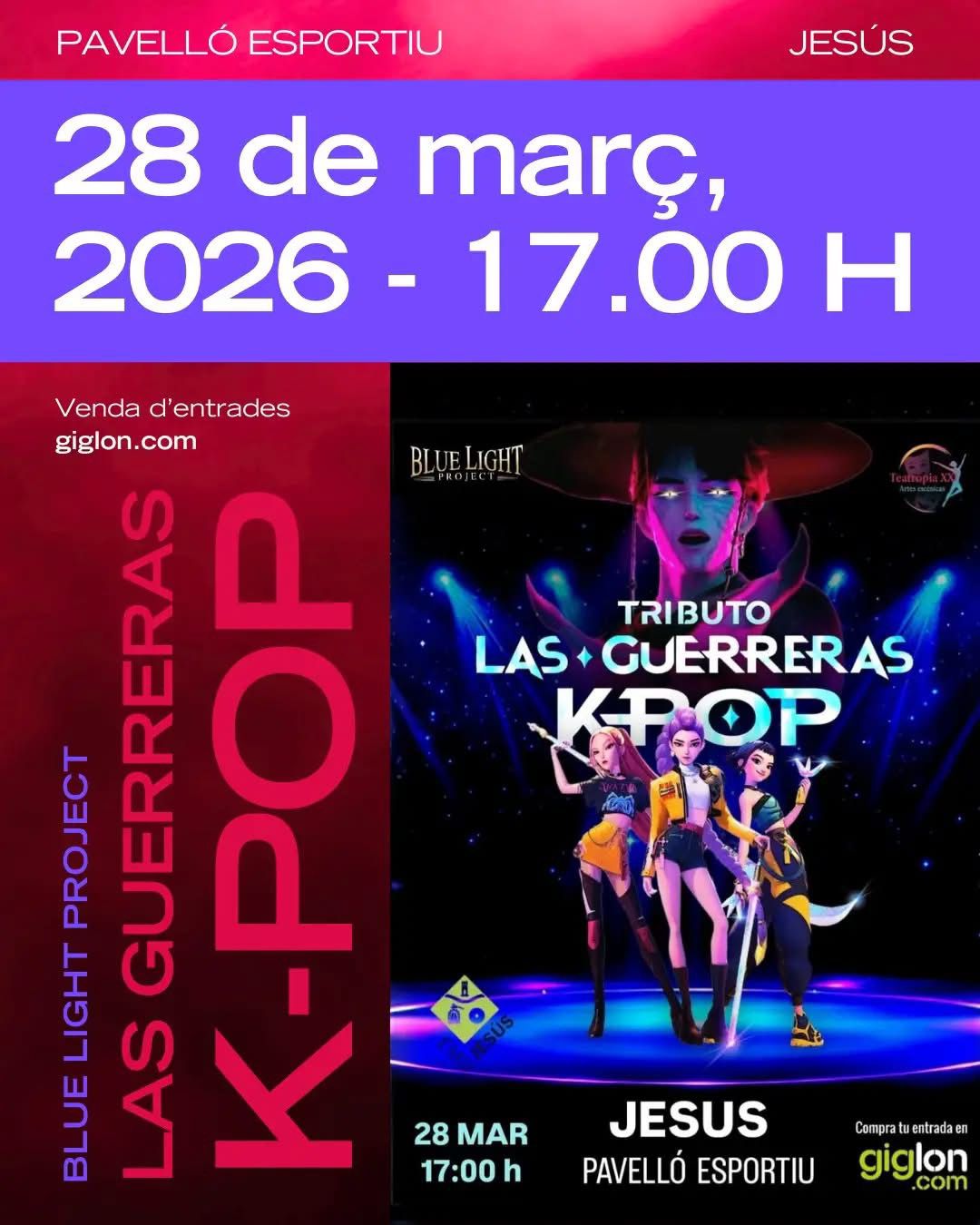 Arriba a Jesús l’espectacle que està triomfant arreu! Tribut a les Guerreres K-POP. Un xou espectacular amb música, llum, coreografies i molta energia. 28 de març de 2026 17.00 h Pavelló de Jesús No t’ho perdis i vine a viure una experiència única plena de ritme i emoció!
