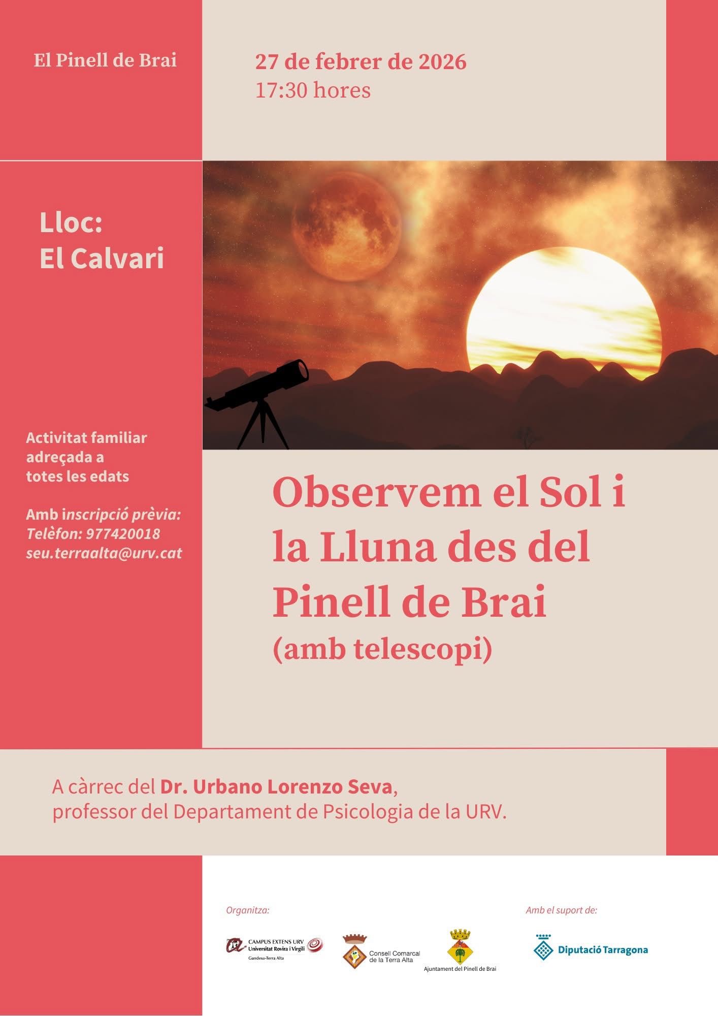 Us convidem a participar a l’activitat ‘Observem el Sol i la Lluna des del Pinell de Brai’, que organitza la seu Gandesa-Terra Alta del Campus Extens de la URV el pròxim divendres 27 de febrer, a les 17.30 h, al Calvari del Pinell de Brai.