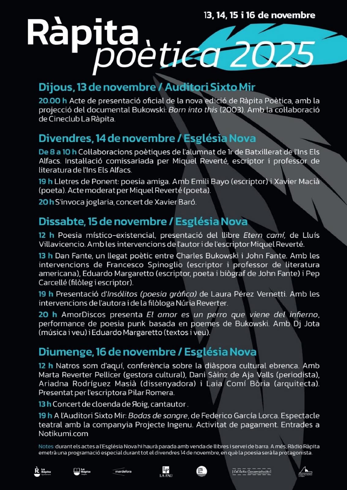 Del 13 al 16 de novembre, Sant Carles de la Ràpita acull la Ràpita Poètica 2025, un festival que omplirà l'Auditori Sixto Mir i l'Església Nova de poesia, música i teatre. El programa inclou la projecció del documental Bukowski: Born into this i un homenatge al poeta Dan Fante. També hi haurà concerts de Xavier Baró i Eloig, l'espectacle de poesia punk d'AmorDiscos, i una conferència sobre la diàspora cultural ebrenca. Com a cloenda, es podrà veure un espectacle teatral sobre Lorca (amb entrada de pagament). La majoria dels actes són gratuïts! Una cita ineludible amb la cultura al Delta de l'Ebre.