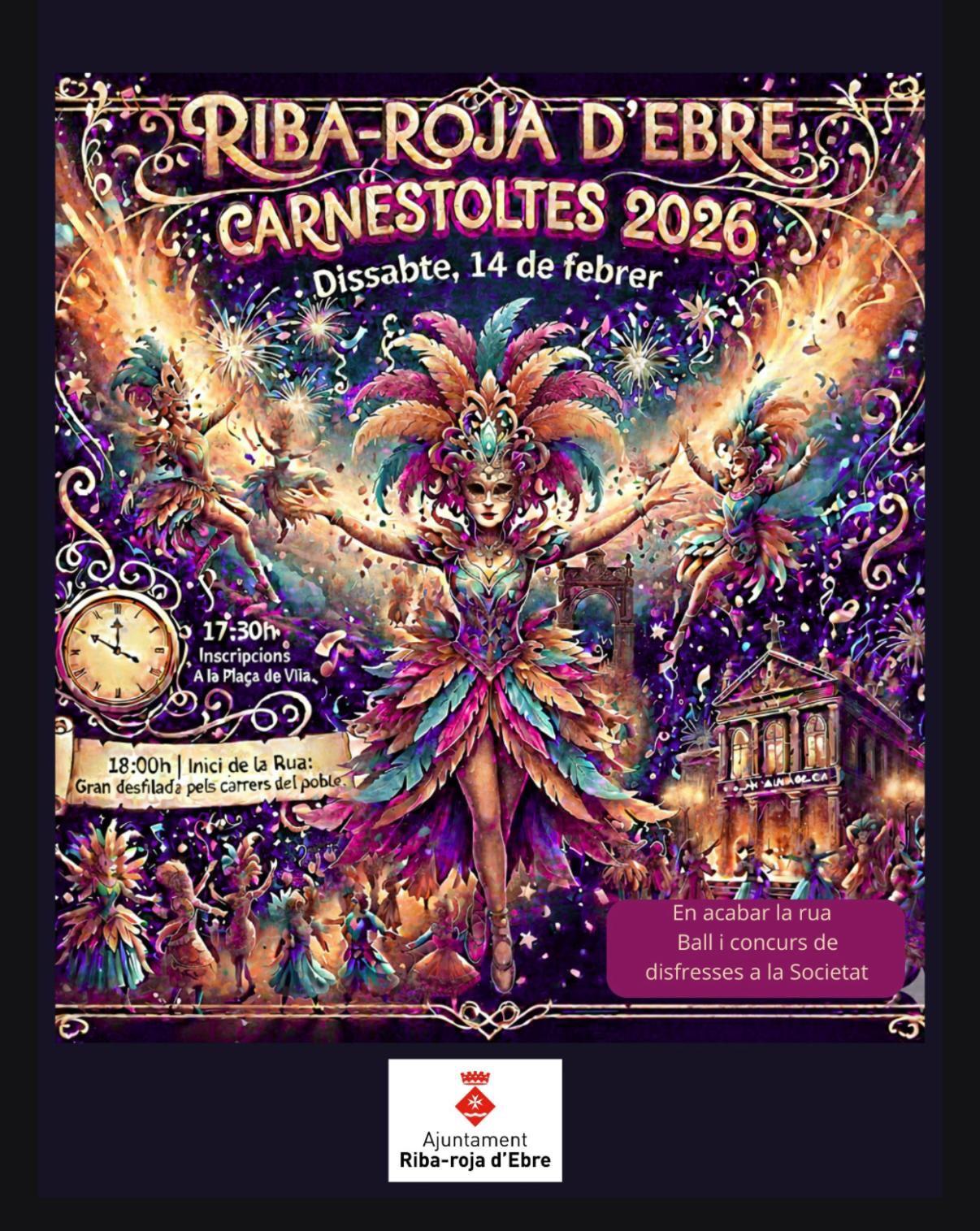 El dia 14 de febrer se celebra Carnestoltes a la Riba-roja amb una gran desfilada pels carrers del poble i en acabar la rua hi haurà concurs de disfresses i ball per a tothom. Les inscripcions s'efectuaran a la Plaça de Vila a les 17:30 h.