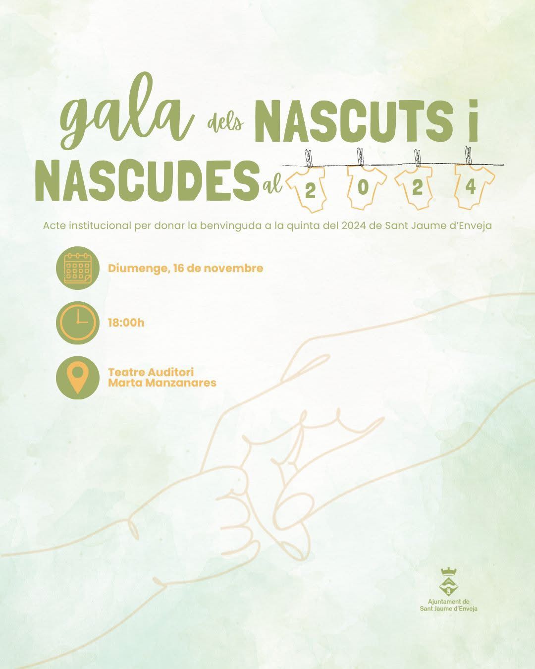 El proper cap de setmana, donarem la benvinguda als nascuts i nascudes l'any passat a Sant Jaume d'Enveja. La gala tindrà lloc el diumenge 16 de novembre a les 18.00h al Teatre Auditori Marta Manzanares, Sant Jaume d'Enveja.