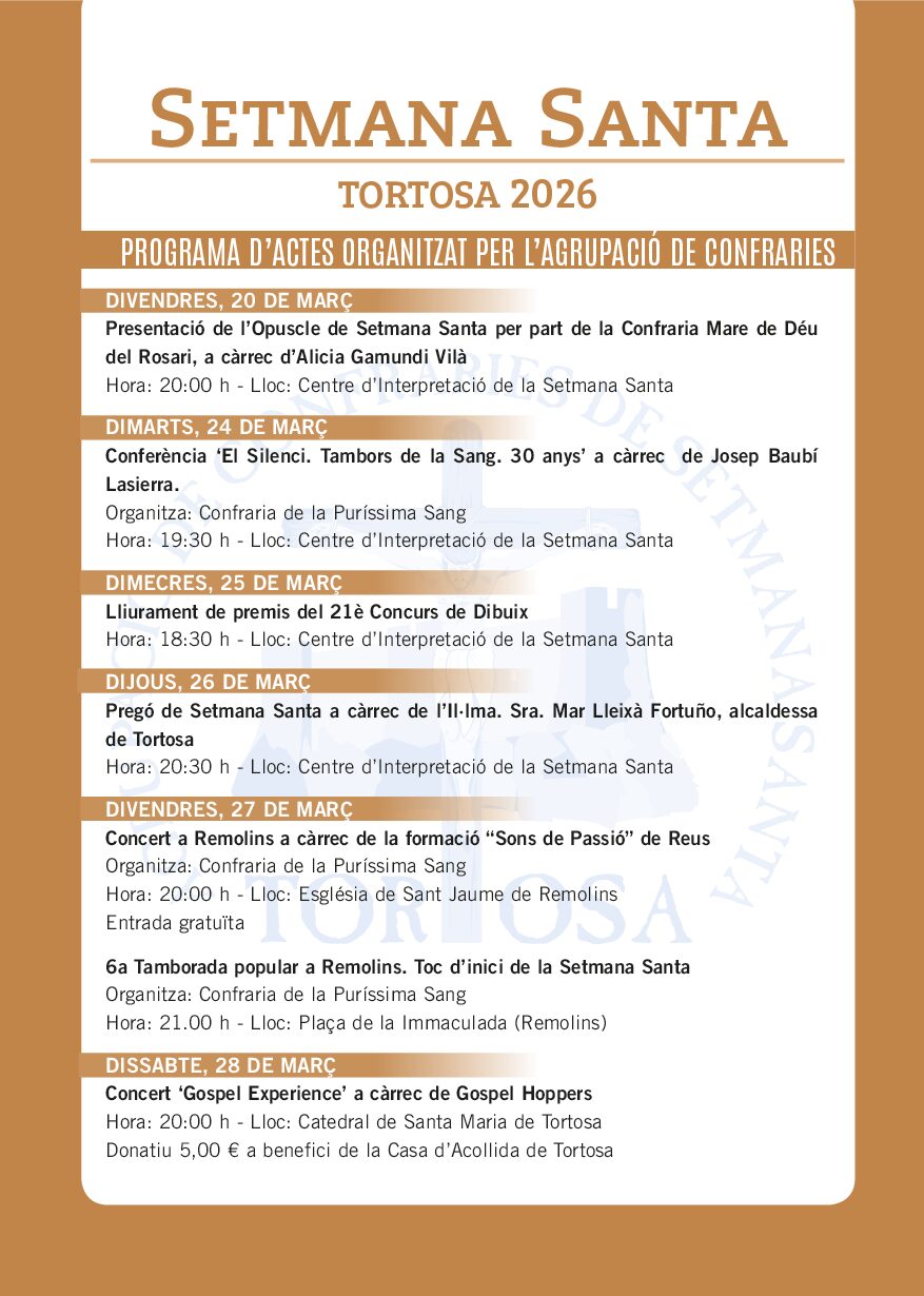 El programa, organitzat per l’Agrupació de Confraries, combina tradició, cultura i participació ciutadana, consolidant la Setmana Santa de Tortosa com un dels esdeveniments més rellevants del calendari local.