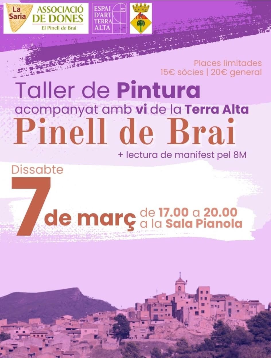 El dia 7 de març vine al Pinell de Brai a disfrutar d'un taller de pintura acompanya't amb vi de la Terra Alta per celebrar el dia Internacional de la Dona de la millor forma. Plaçes limitades. 15€ SÒCIES i 20€ GENERAL