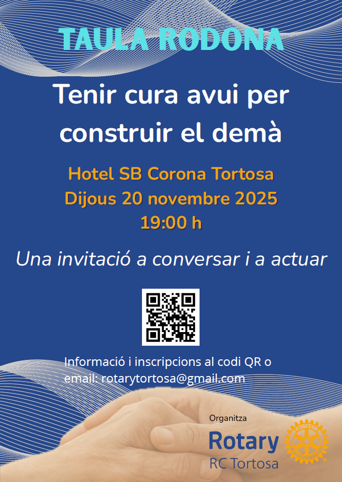 El Club Rotary de Tortosa t'invita a la participació d'una taula rodona on el tema el del qual es parlarà serà “Tenir cura avui per construir el demà”, tindrà lloc el pròxim 20 de novembre de 2025 a les 19.00 h a l’Hotel SB Corona Tortosa. L'aforament és limitat, per confirmar assistència cal escanejar el codi QR que apareix al cartell.