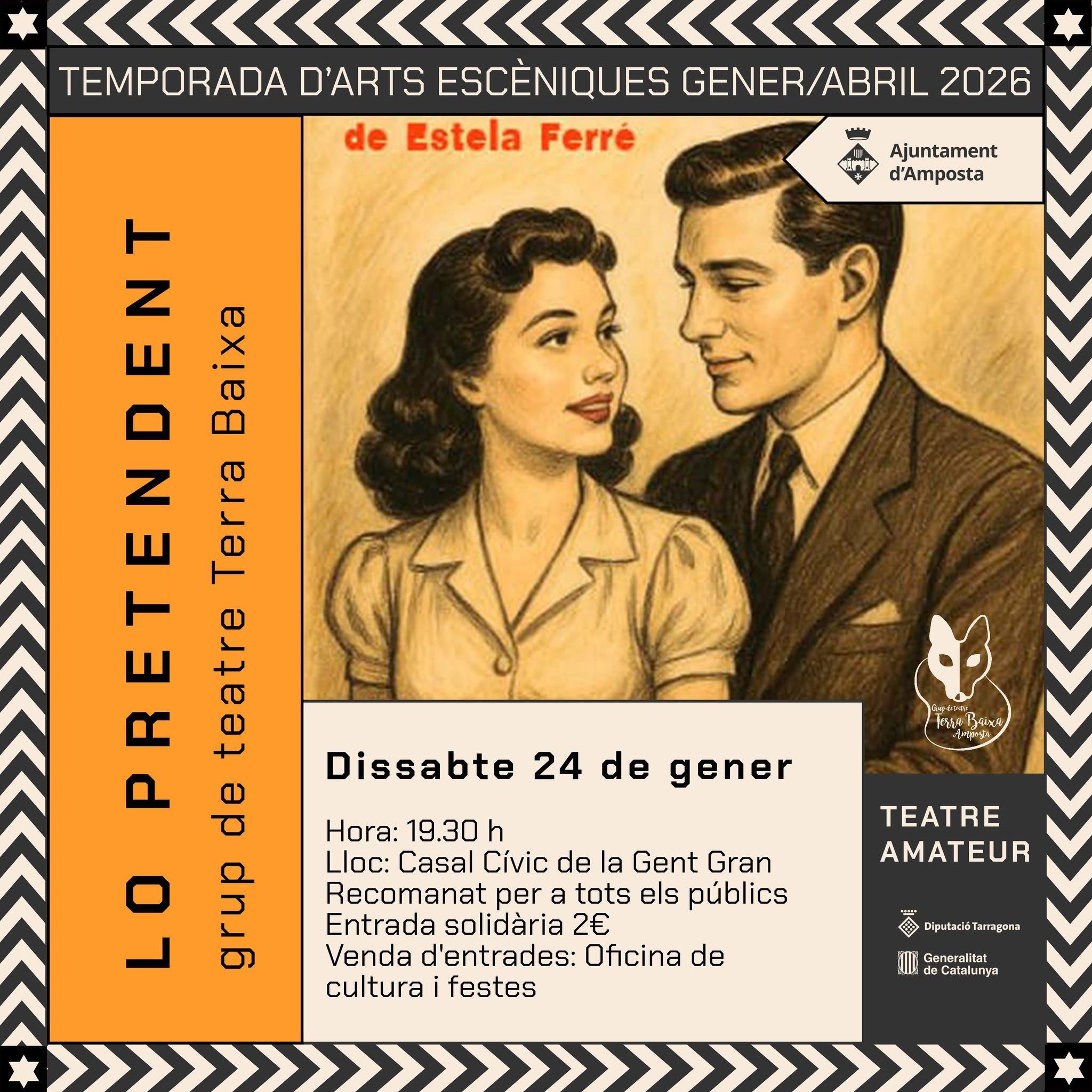 ARTS ESCÈNIQUES | Aquest dissabte 24 de gener, arranca el cicle de Teatre Amateur, amb "Lo pretendent", a càrrec de Terra Baixa Dissabte 24 de gener 19.30 h Casal Cívic Entrades anticipades a l'Oficina de Cultura i Festes (Caselles del Mercat) Entrada solidària de 2 euros a favor de Libèl·lules dels Estels Aquesta acció està alineada amb els ODS 11 i 17 de l'Agenda 2030