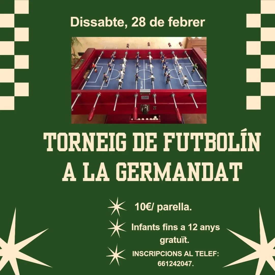 TORNEIG DE FUTBOLÍ A LA GERMANDAT! Dissabte 28 de febrer a les 17:00h, la Germandat organitza un torneig de futbolí que no et pots perdre! Si t’agrada passar-ho bé, competir amb amics i gaudir d’una tarda plena d’emoció i bon rotllo, aquest és el teu moment! Podràs formar parella amb qui vulguis i demostrar qui domina la taula del futbolí. La inscripció és només 10€ per parella, i per fer-ho encara més especial, els infants fins a 12 anys podran jugar totalment gratis! Així que no dubtis a portar tota la família. Què t’ofereix aquest torneig? Competència amistosa i molt d’humor Premis i sorpreses pels guanyadors Bona música i un ambient súper agradable per a tothom No cal ser un expert, només ganes de passar-ho bé! I si no tens parella, també podem ajudar-te a trobar-la. Per inscriure’t, truca al 661 24 20 47 o parla amb qualsevol membre de la junta de la Germandat. Places limitades! No deixis que t’ho expliquin, viu-ho en primera persona! T’esperem per gaudir d’una tarda inob